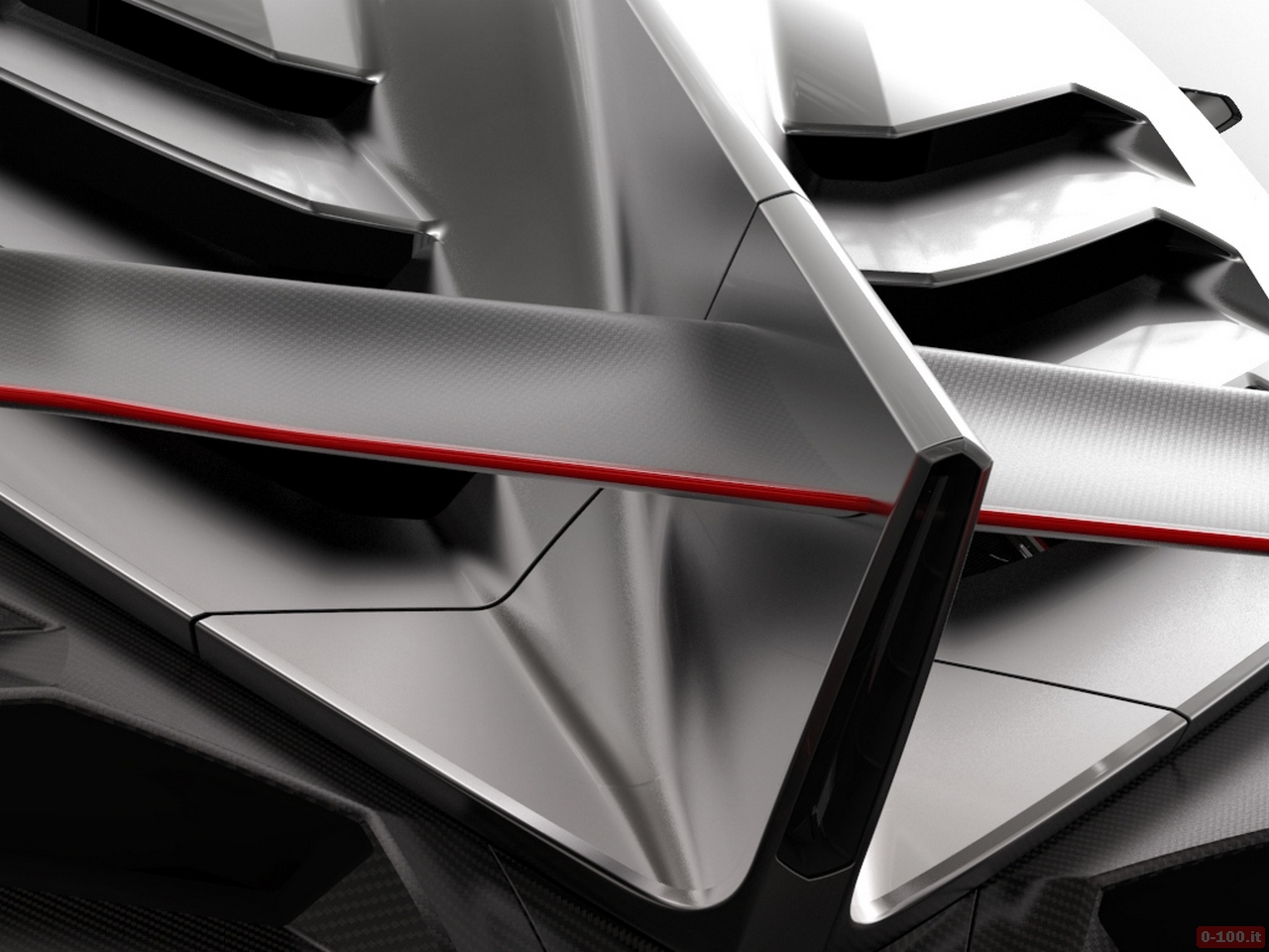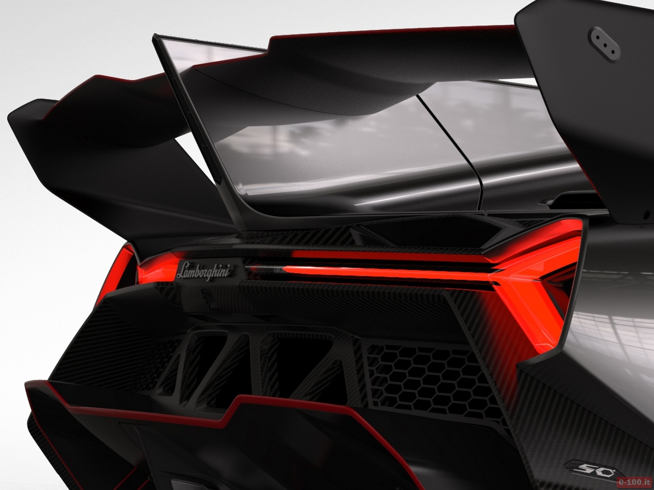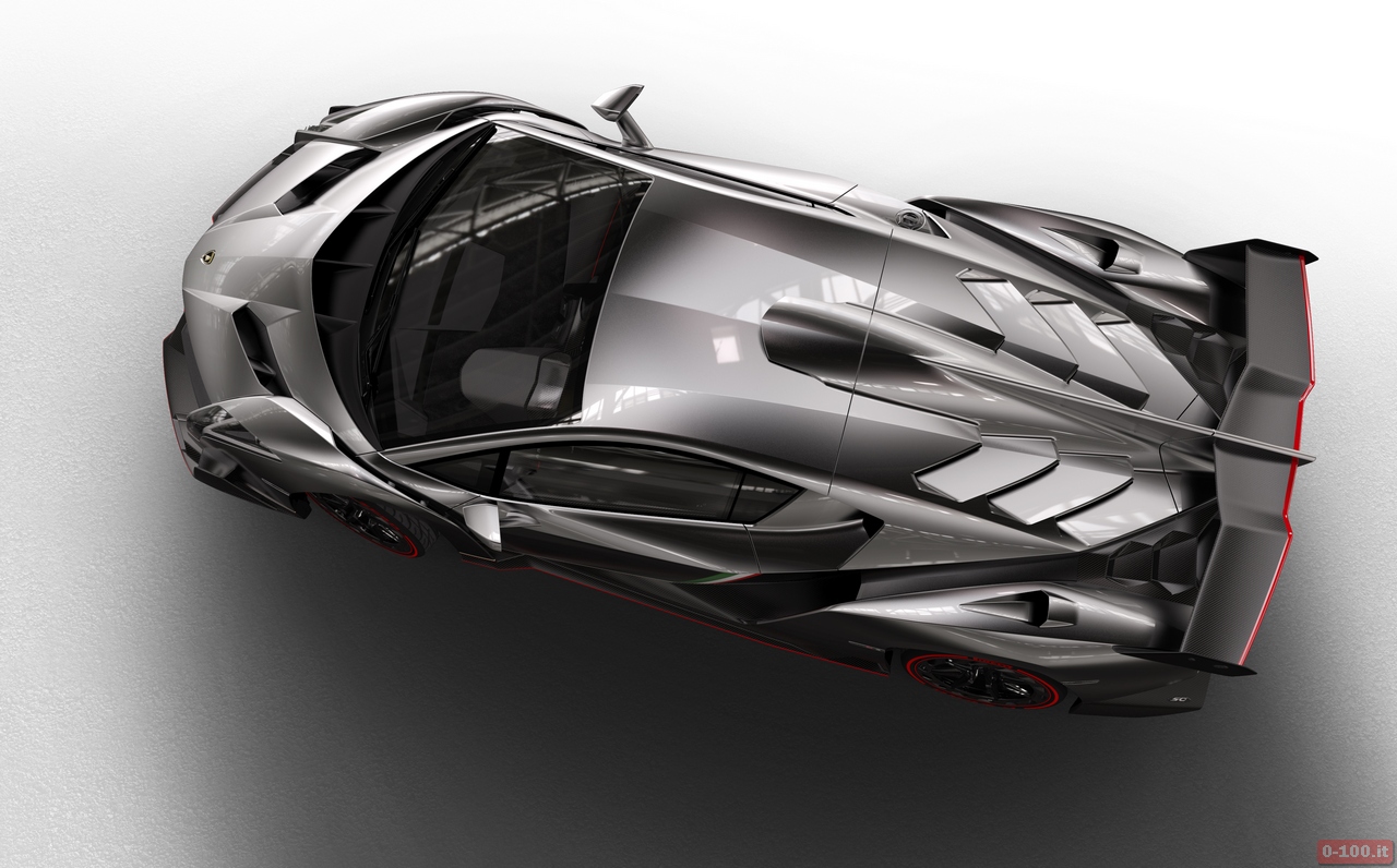 Procedendo verso la coda la Lamborghini Veneno sfoggia un fondo piatto, che in coda diventa un grande estrattore con al centro 4 scarichi. La parte superiore della carrozzeria è dominata da un’enorme ala regolabile con funzione aerodinamica.