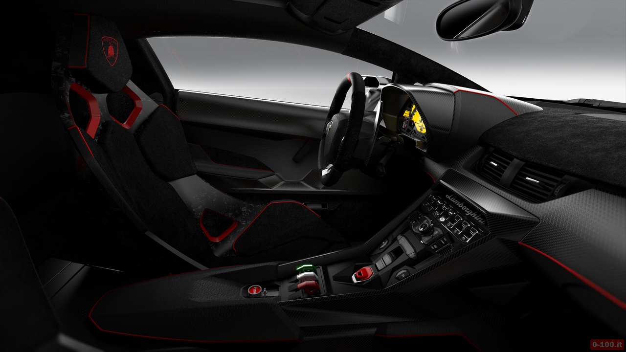 Alcune delle parti della scocca risultano visibili in abitacolo: tunnel centrale e fasce sottoporta sono esattamente lo scheletro della Lamborghini Veneno, a significare leggerezza, estremizzazione. I sedili, molto leggeri, sono realizzati in forged composite e rivestiti (come parte dell’abitacolo) in CarbonSkin, una specie di “pelle” di fibra di carbonio.