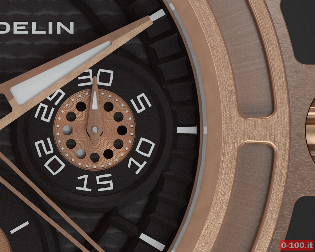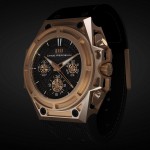 La sua cassa in oro con finitura satinata, dalle forme imponenti e aggressive, misura 44 mm di diametro e 15 di spessore ed è corredata da vetro in cristallo di zaffiro lato quadrante e lato fondello per un’impermeabilità fino a 100 metri di profondità.