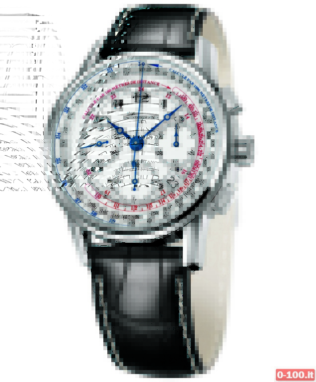 Sul quadrante, bianco laccato con lancette azzurrate Breguet, è possibile misurare, utilizzando la scala tachimetrica, la velocità media di un oggetto utilizzando, come intervallo dello spazio, 1.000 metri (scala di colore rosso) o 100 metri (scala di colore blu).