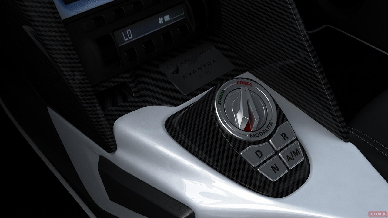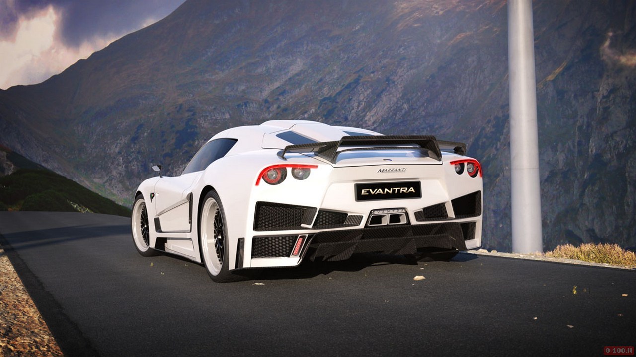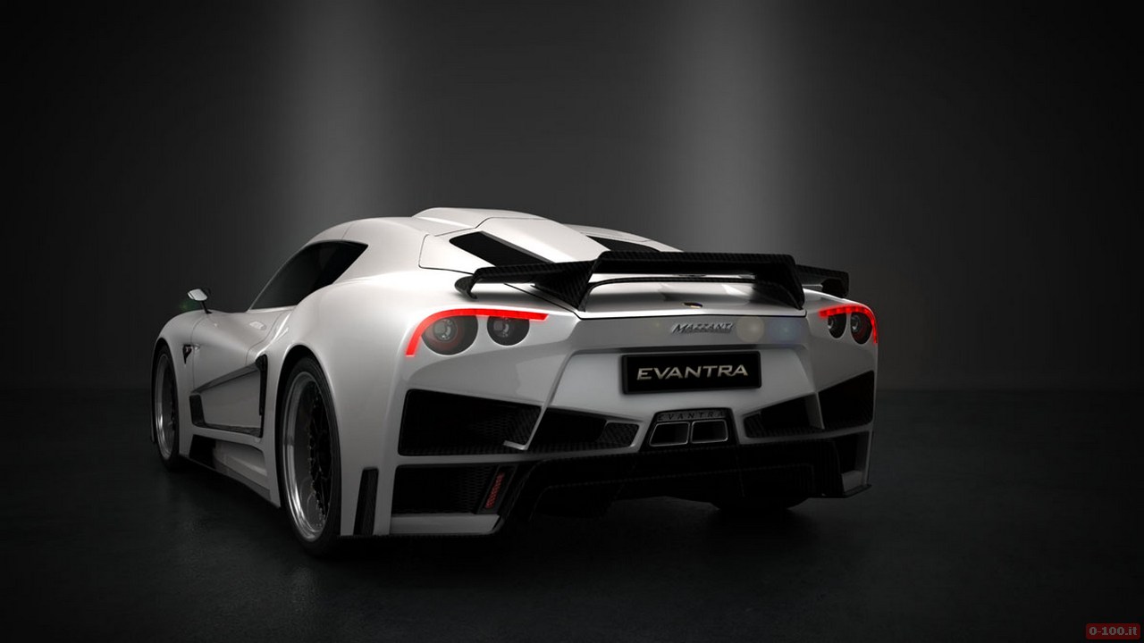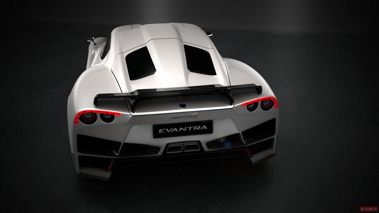 L’Evantra V8 sarà prodotta in soli 5 esemplari l’anno. Sopra un telaio in acciaio scatolato, unito a una gabbia in tubi in cromo-molibdeno posizionata all’ interno dell’abitacolo, Luca Mazzanti e Zsolt Tarnok (Mazzanti automobili chief designer) hanno creato forme uniche, che non assomigliassero a nessun’altra. Il processo di affinamento aerodinamico è stato realizzato insieme alla Ysim di Parma, azienda con notevole background in F1 e Le Mans.