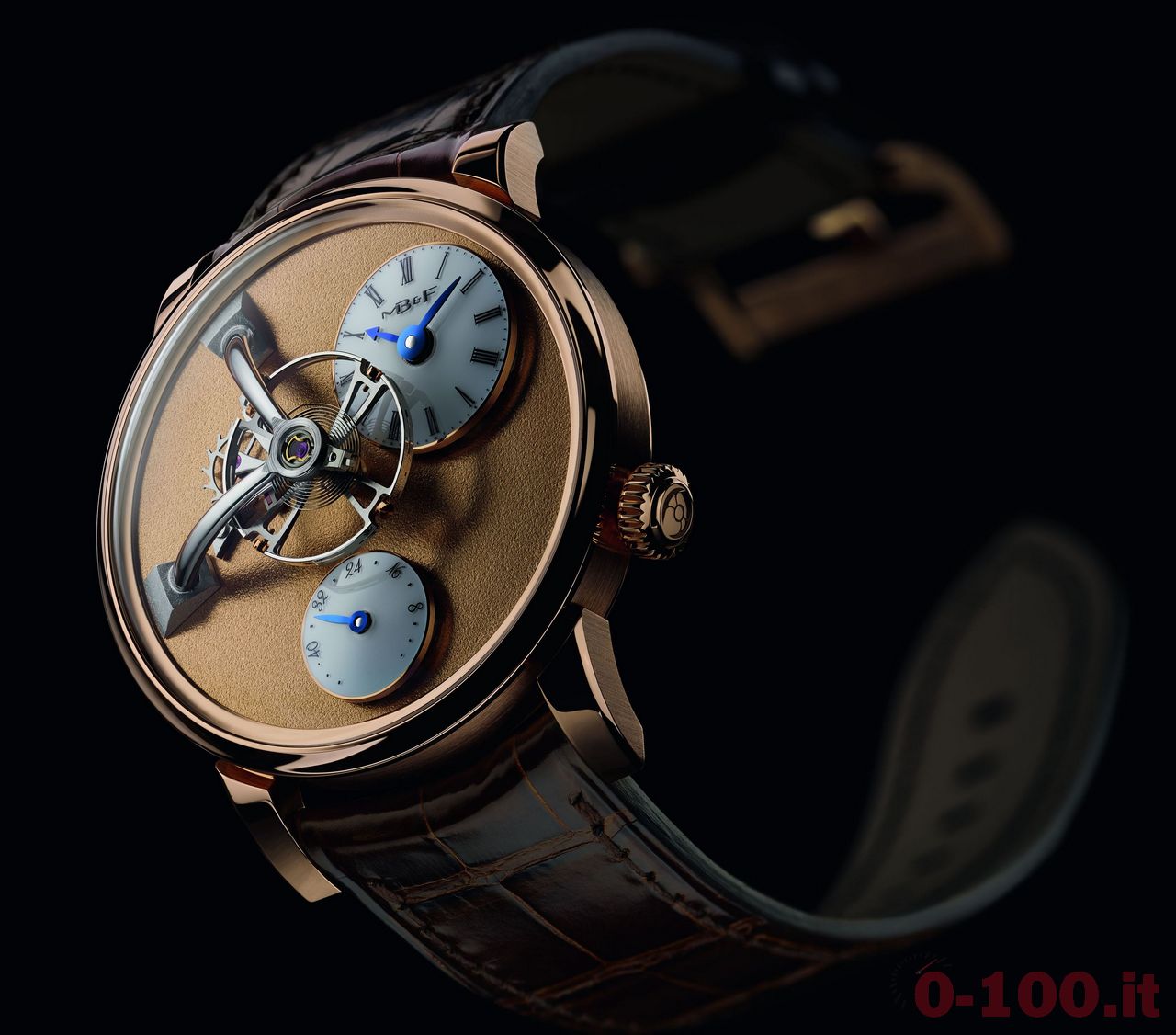 Il cuore pulsante di questo incredibile segnatempo è un movimento tridimensionale sviluppato in-house da MB&F . Meccanico a carica manuale, è composto da 229 componenti, ha un unico bariletto, una spirale con curva tradizionale Breguet, oscilla alla frequenza di 18.000 alternanze l’ora e assicura un’autonomia di marcia a carica completa di 45 ore.