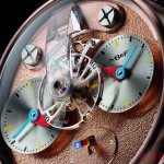 L’estroso designer francese Silberstein ha immaginato dei sotto-quadranti concavi per raccogliere il “tempo infinito” al posto di quelli convessi dell’originale LM1. Ha inoltre sostituito il doppio arco del ponte del bilanciere originale (14 mm) con un arco singolo in vetro zaffiro trasparente (2 anni di sviluppo) che sembra quasi galleggiare come sospeso sopra i quadranti gemelli consentendo una visuale completa delle indicazioni dell’ora e dello scappamento posizionato su di un lato del display.