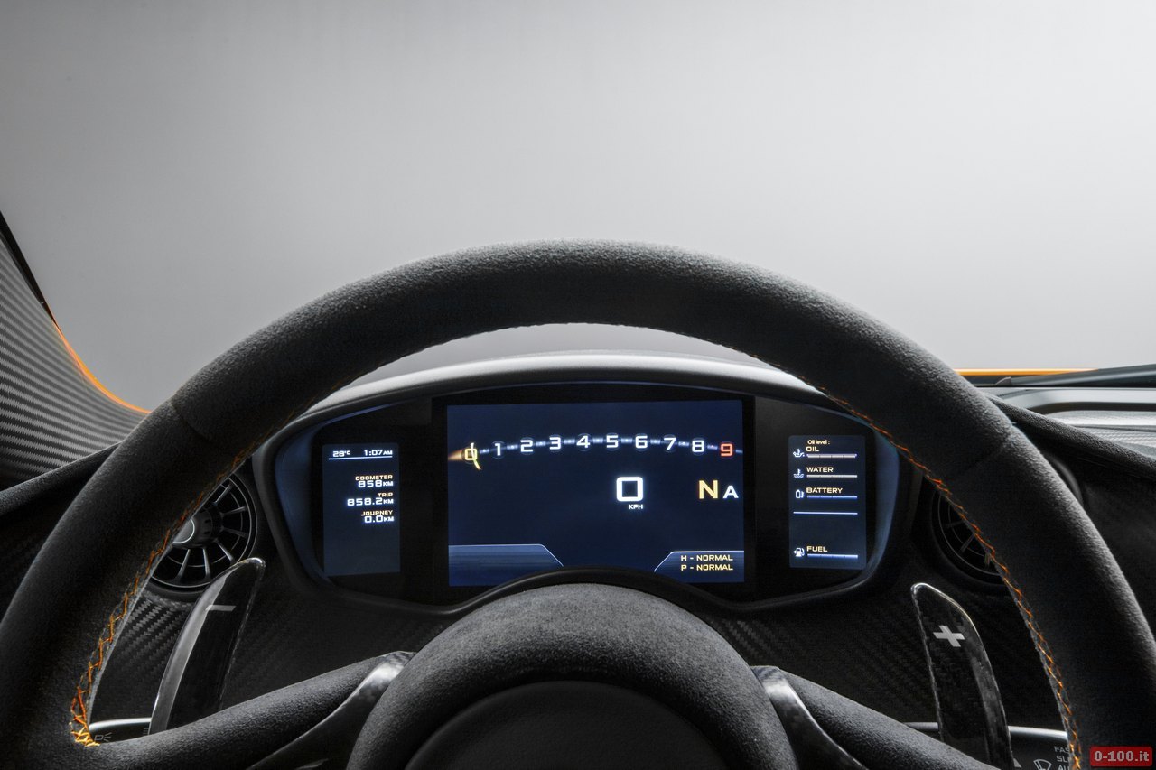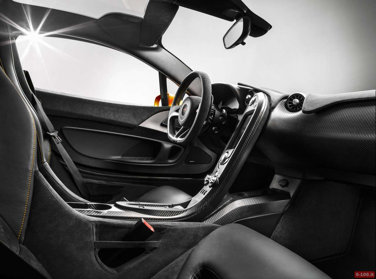 McLaren ha voluto creare un cockpit essenziale al limite, con pochi pulsanti, con molte parti della scocca in fibra di carbonio lasciate a vista. I sedili, ad esempio, sono fissi. Gli schienali sono inclinati di 28° ma l’inclinazione può aumentare fino a 32° per guadagnare un po’ di spazio in altezza nel caso si utilizzi il casco.