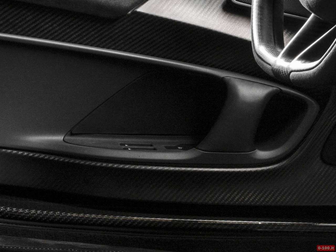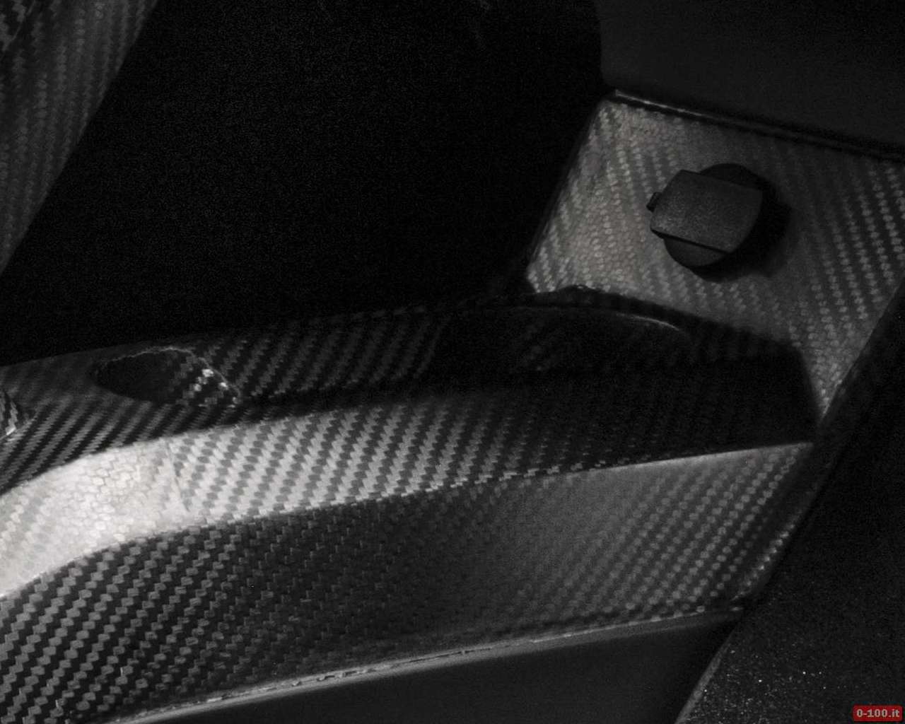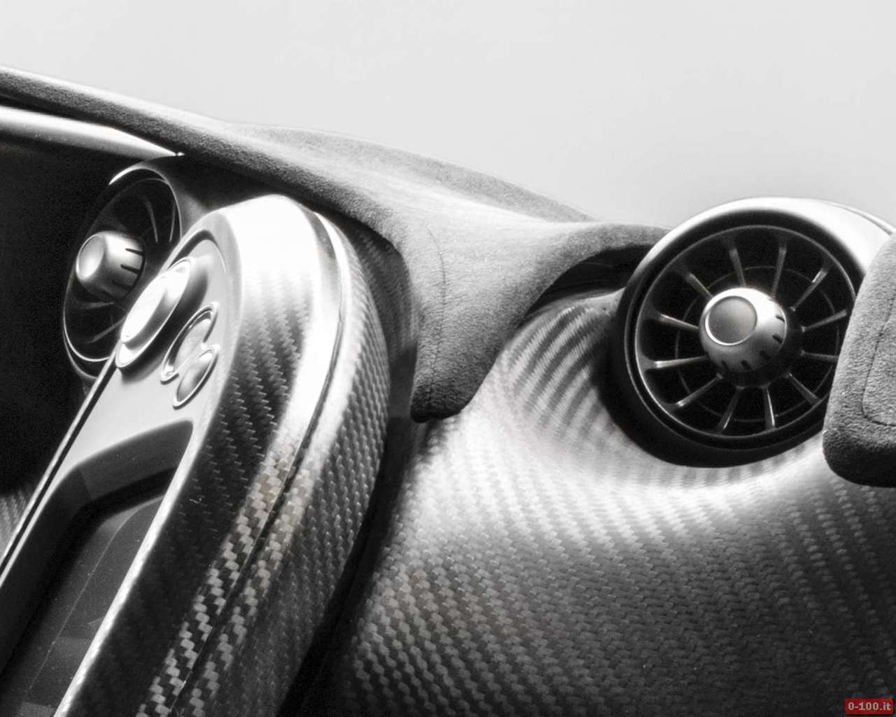 L’immagine mostra un abitacolo essenziale, regno della fibra di carbonio (sedili, pannelli porta, pavimento, tunnel centrale che si solleva fino in cima alla plancia, plancia) con un tocco sportività luxury grazie a pelle e Alcantara.