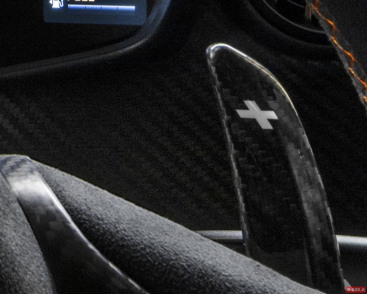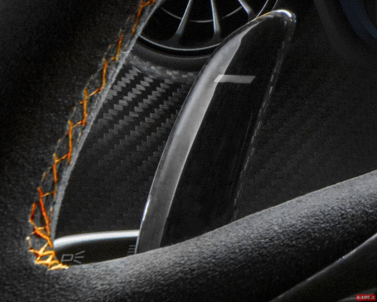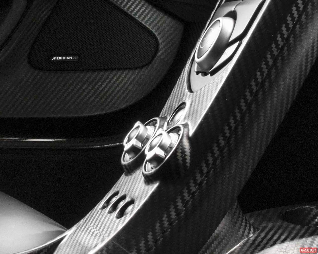 L’immagine mostra un abitacolo essenziale, regno della fibra di carbonio (sedili, pannelli porta, pavimento, tunnel centrale che si solleva fino in cima alla plancia, plancia) con un tocco sportività luxury grazie a pelle e Alcantara.