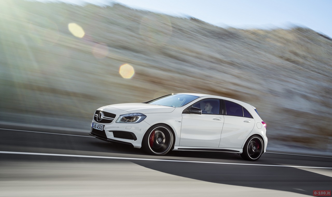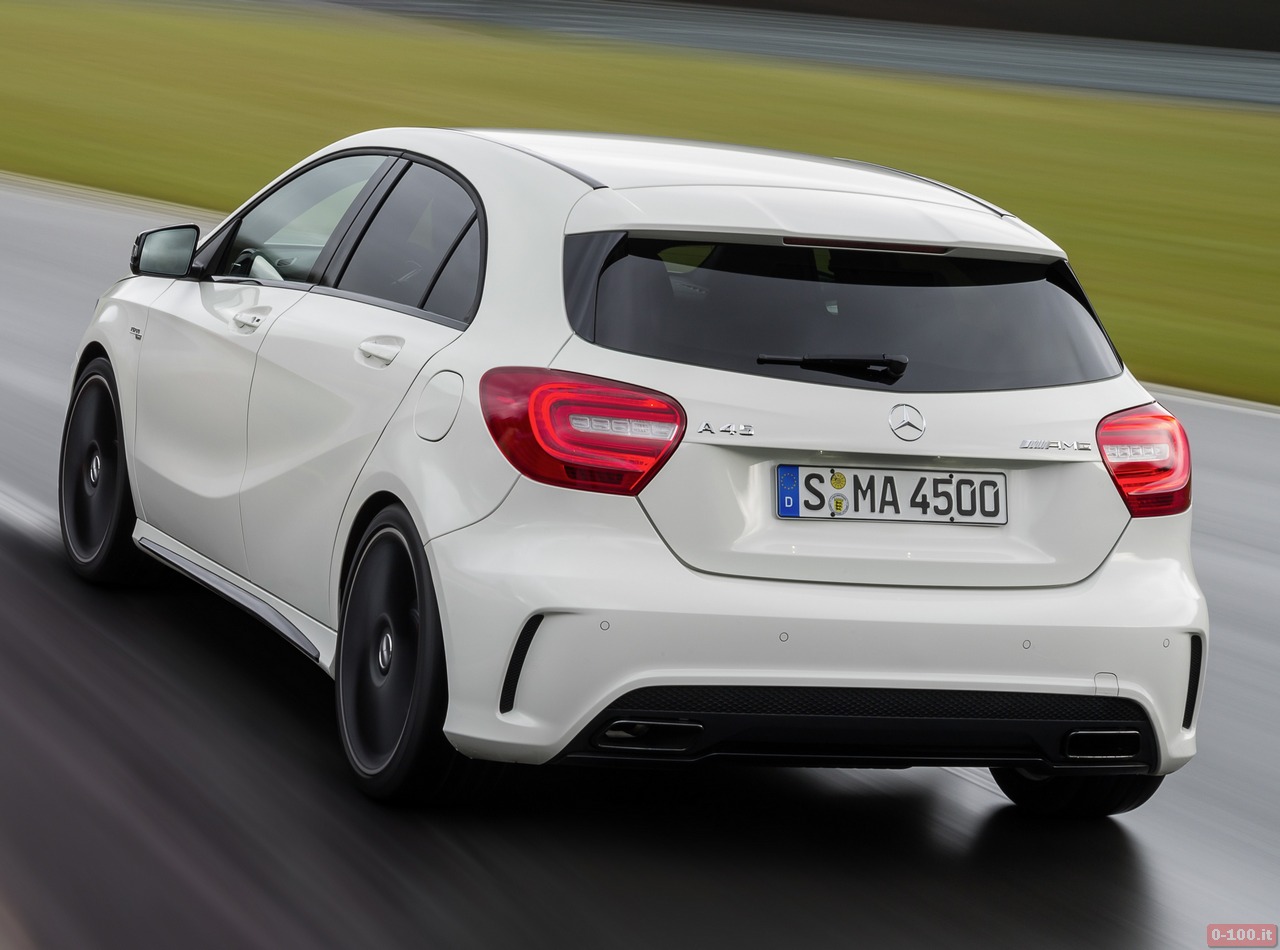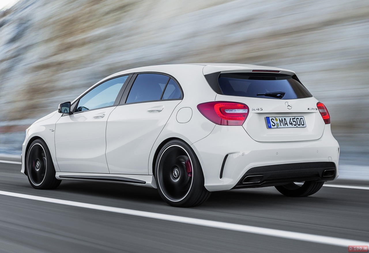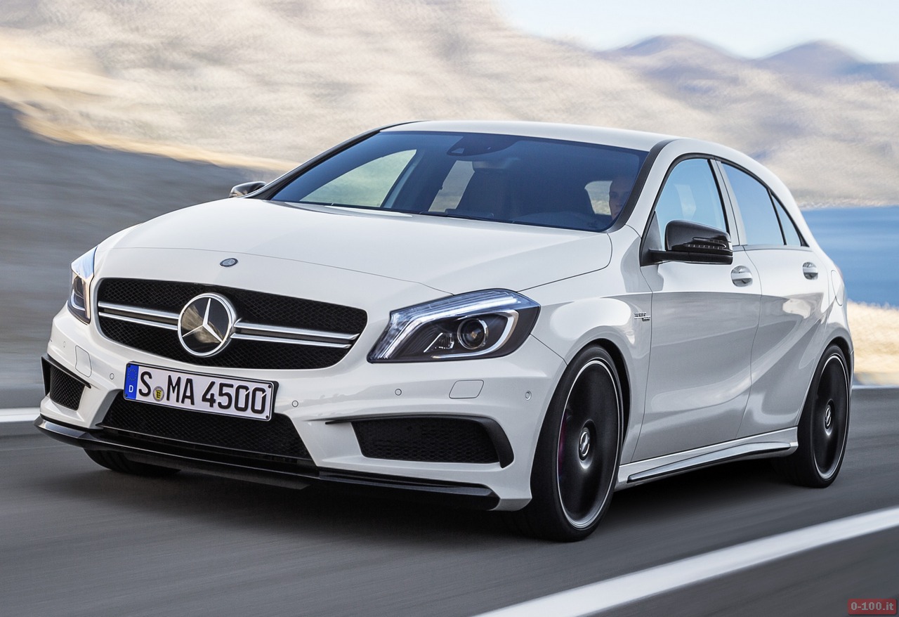 Della Mercedes A45 AMG, al debutto al Salone di Ginevra 2013, parlano soprattutto i dati relativi alle prestazioni: 0-100 in 4″6 e 250 km/h di punta massima autolimitata.