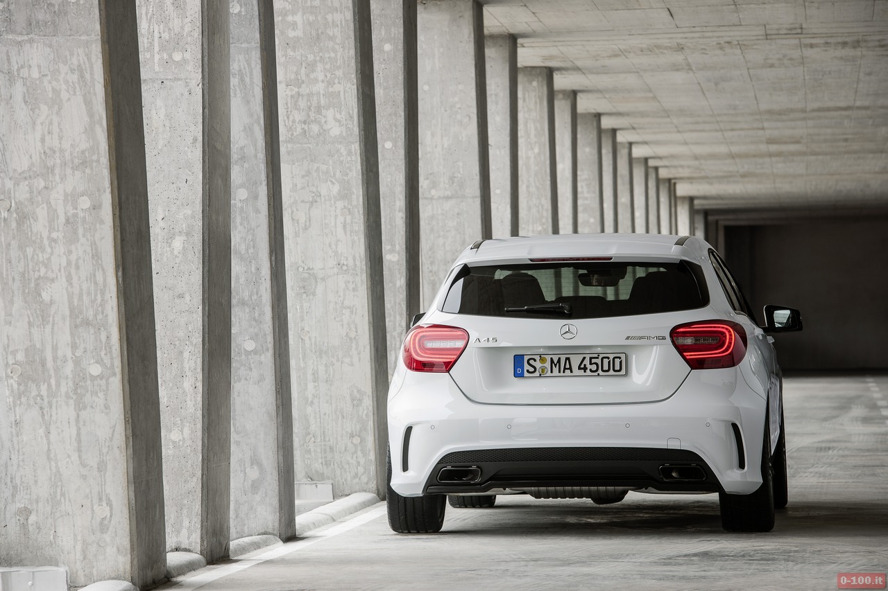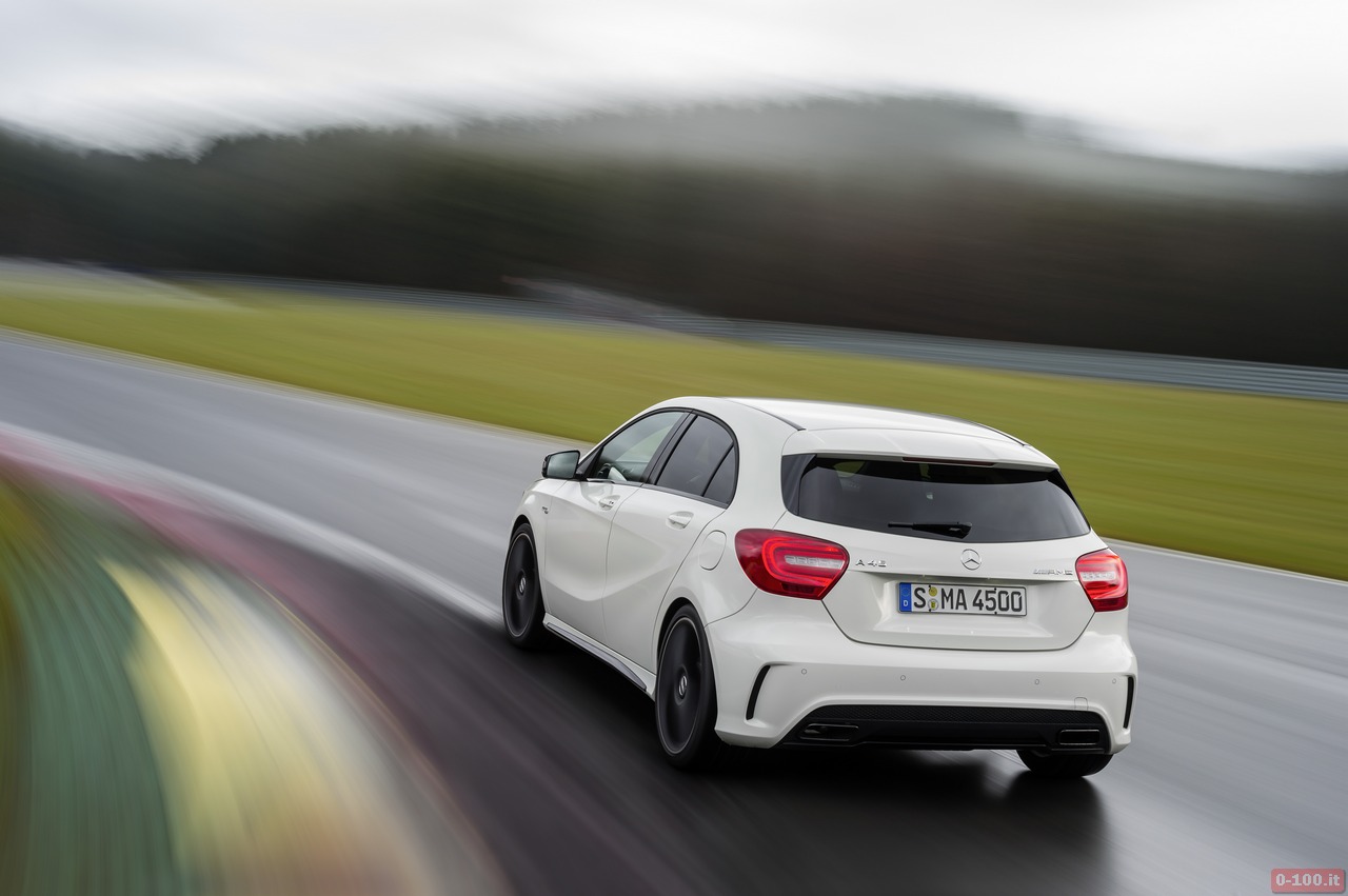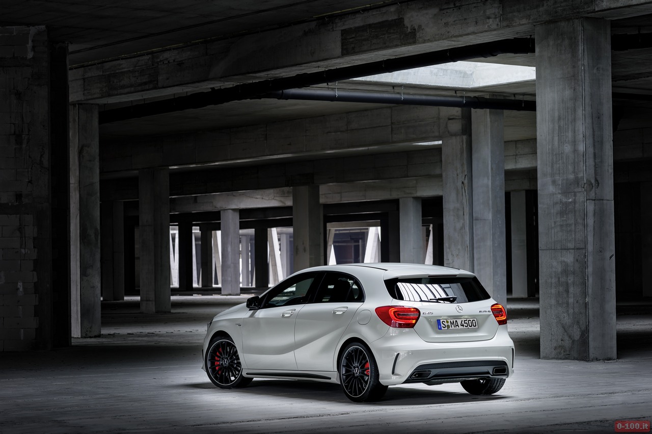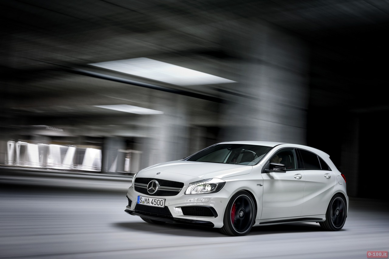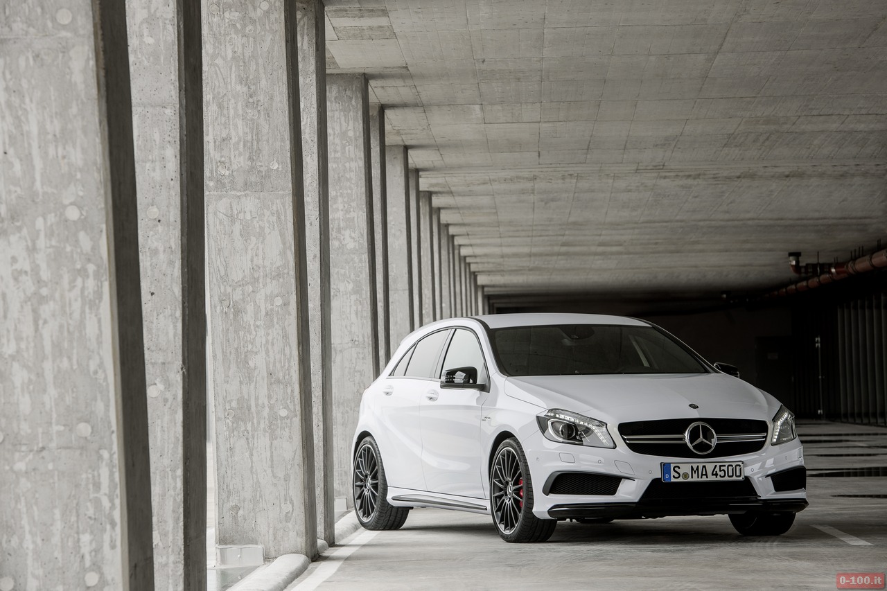 Della Mercedes A45 AMG, al debutto al Salone di Ginevra 2013, parlano soprattutto i dati relativi alle prestazioni: 0-100 in 4″6 e 250 km/h di punta massima autolimitata.