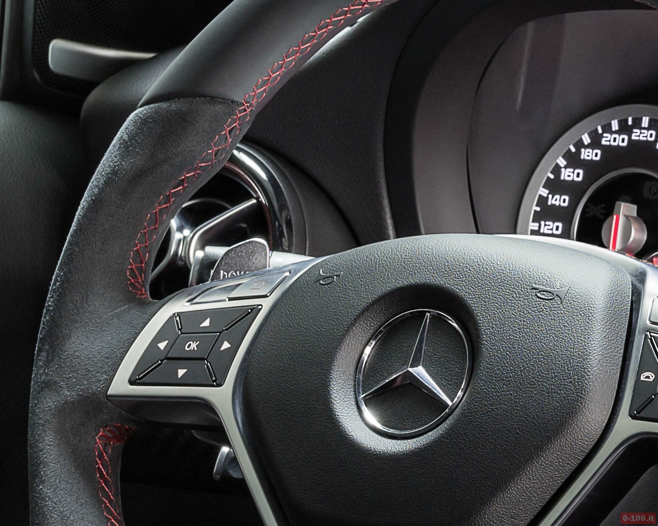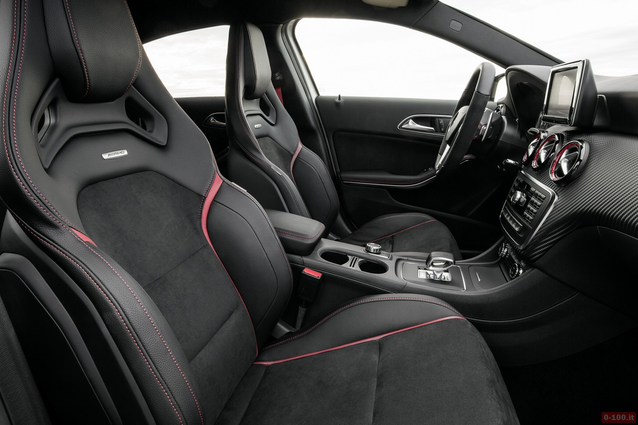 Gli interni della A45 AMG abbandonano la tipica classe Mercedes per entrare nel regno della sportività. Di serie ci sono i sedili sportivi in pelle ecologica ARTICO/microfibra DINAMICA con cuciture di contrasto rosse, il volante sportivo multifunzione con comandi integrati e la DRIVE UNIT AMG; la plancia in carbon look, bocchette di aerazione nere/rosse, le cinture di sicurezza rosse e le soglie di ingresso AMG.