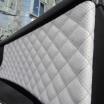 L’abitacolo è stato personalizzato con rivestimenti in pelle bicolore bianca/nera con cuciture bianche e modanature in fibra di carbonio.