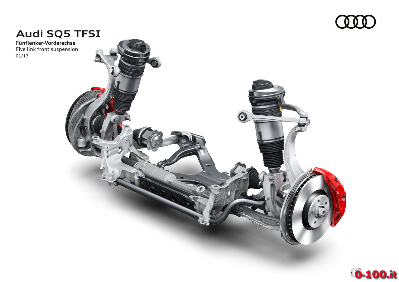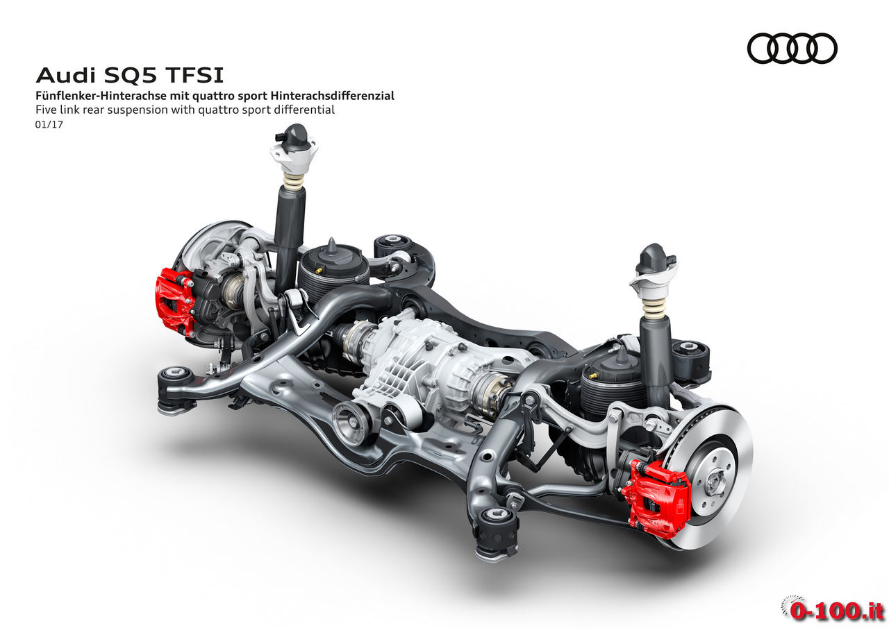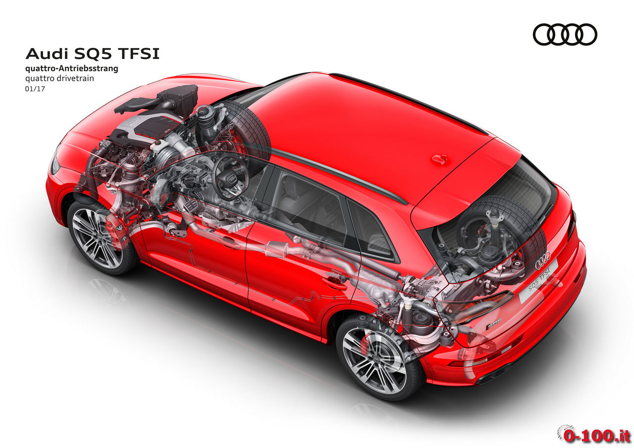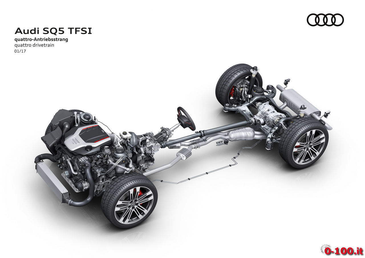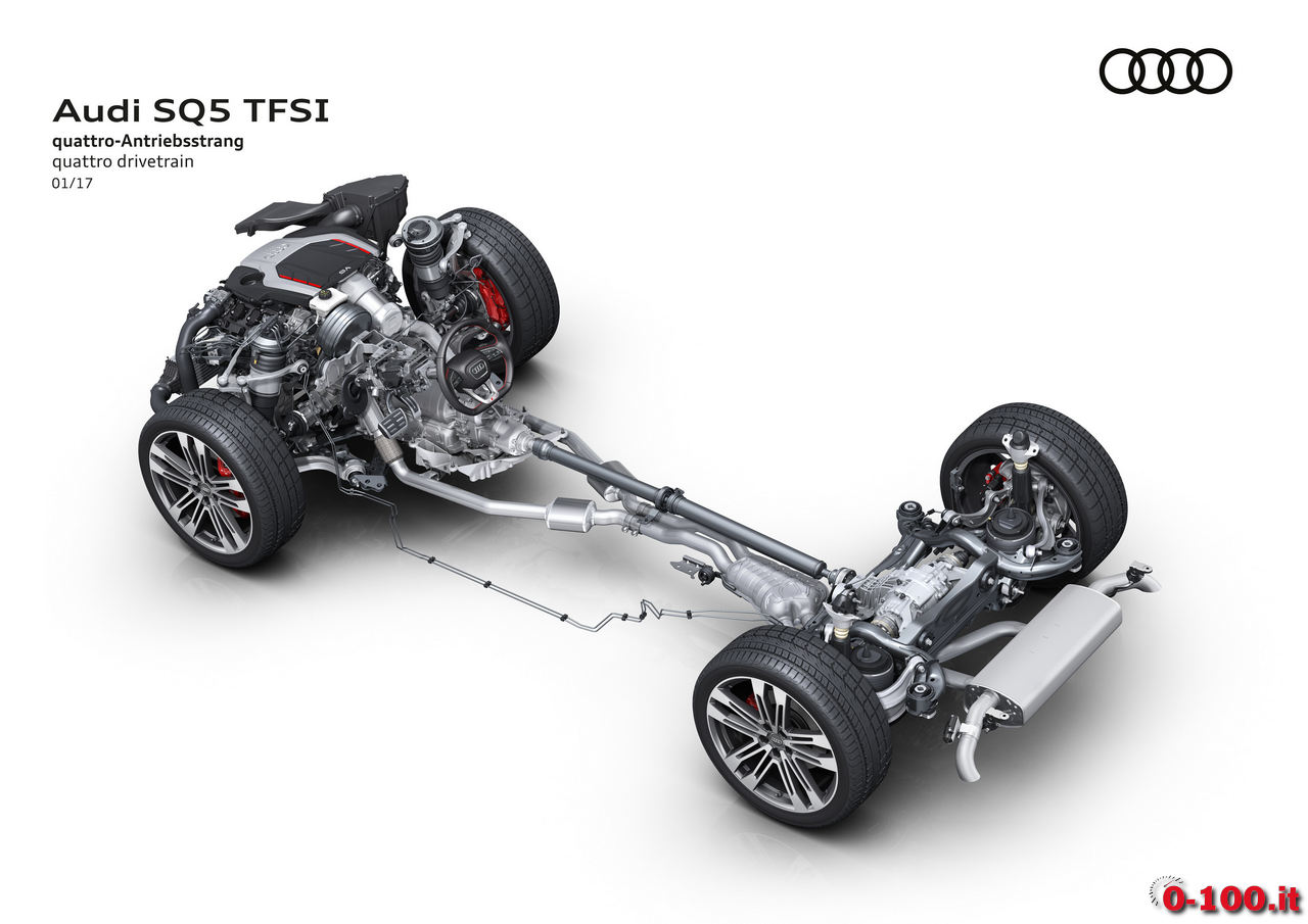 L’Audi SQ5 TFSI è equipaggiata con trazione integrale quattro (con maggioranza della coppia sull’asse posteriore e torque vectoring selettivo per ogni singola ruota; a richiesta è disponibile il differenziale sportivo) e cambio automatico Tiptronic 8 rapporti. Per ridurre i consumi, tra i 55 e 160 orari viene effettuato il disaccoppiamento tra motore e trasmissione non appena venga rilasciato il gas.