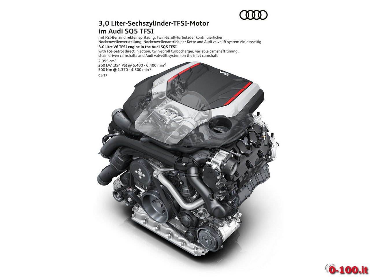 Il 6 cilindri a V di 3 litri è equipaggiato con turbocompressore Twin-scroll posizionato al centro della V. Si tratta di un propulsore a “ciclo B” e con iniettori ad alta pressione sistemati al centro della camera di combustione. La caratteristica principale, secondo un aggiornamento tecnico (in realtà un ciclo “Miller”, che prevede tempi diversi nelle fasi di un motore a ciclo 8) introdotto nel maggio 2015 e presente anche sul 2.0 TFSI da 190 Cv, riguarda la durata delle fasi del ciclo di funzionamento. La fase di aspirazione ha una durata più breve (dunque minor carburante entra nella camera di scoppio rispetto a una fase standard), laddove l’espansione ha una durata maggiore. L’aspirazione breve crea una maggiore compressione quindi un miglior rendimento termodinamico. Il pericolo di eventuali battiti in testa, tipici di questo genere di layout, viene scongiurato dalla presenza dell’Audi valvelift system. Il V6 eroga 354 Cv, con un picco di 500 Nm tra 1.370 e 5.000 giri.