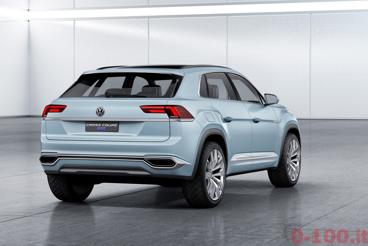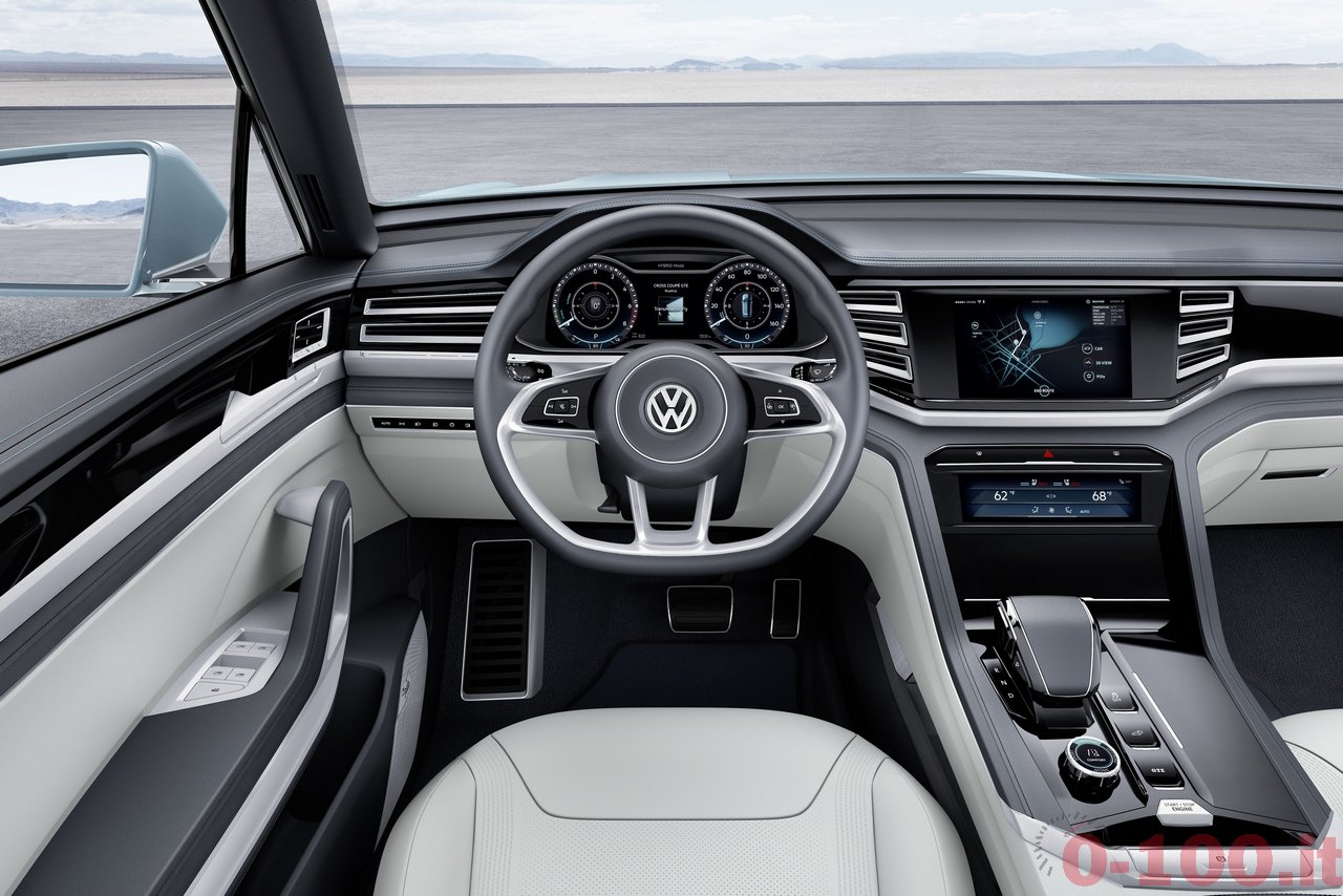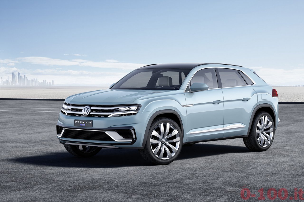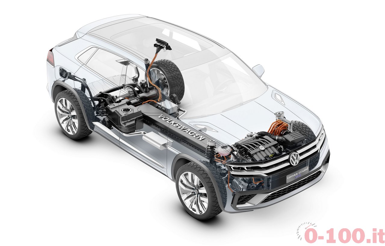 5 METRI DI SUV MEDIO. AL NAIAS 2015 VOLKSWAGEN PROSEGUE L’AVVICINAMENTO AL SUV MEDIO CHE VENDERA’ SUL MERCATO AMERICANO. DOPO CROSSBLUE E CROSSBLUE CONCEPT ECCO LA CROSS COUPE’ CONCEPT CON MOTORE IBRIDO (V6 E 2 MOTORI ELETTRICI). LA TRAZIONE INTEGRALE SFRUTTA UN “ALBERO CARDANICO ELETTRICO”: IL MOTORE (ELETTRICO) CHE MUOVE L’ASSE POSTERIORE E’ COMANDATO VIA CAVO.