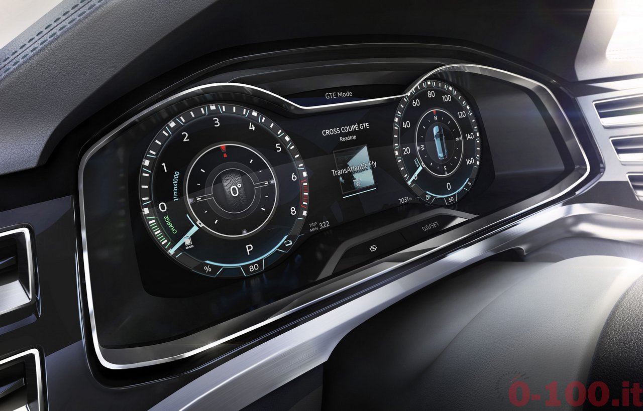 L’abitacolo è stato progettato per rispondere a precisi canoni di funzionalità, sia dal punto di vista dei controlli (la Cross Coupé GTE propone un’interfaccia completamente digitale su strumentazione – Active Info Display da 12,3 pollici e visione 2D o 3D – e plancia, quest’ultima arricchita da schermi touchscreen per l’azionamento di tutti i servizi) sia dal punto di vista del design (plancia a sviluppo orizzontale, design minimalista e funzionalista secondo la scuola tedesca Bauhaus).