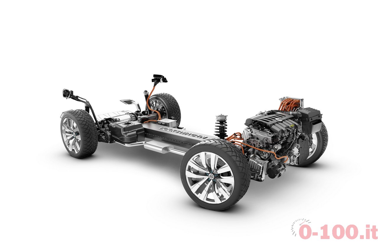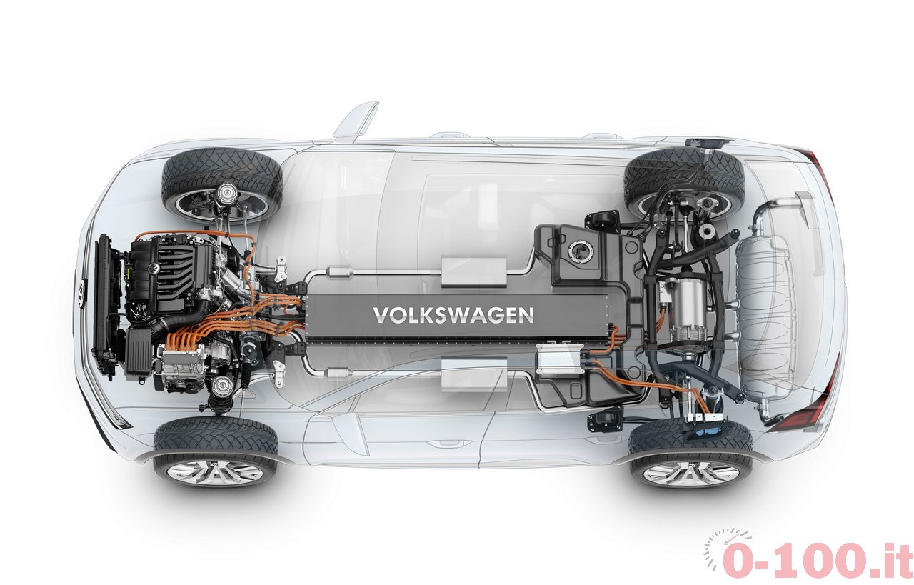La trasmissione si avvale del cambio DSG e, naturalmente, il posizionamento dei motori elettrici sugli assi definisce uno schema di trazione integrale. Le quattro ruote non sono collegate attraverso un classico schema di differenziali e albero di trasmissione centrale ma l’asse posteriore è collegato al sistema di 4WD “via cavo”. Si parla, quindi, di albero cardanico elettrico. In caso di scarsa carica di batteria per muovere l’asse posteriore, il motore V6 funziona come alternatore: ricarica le batterie per fornire potenza.