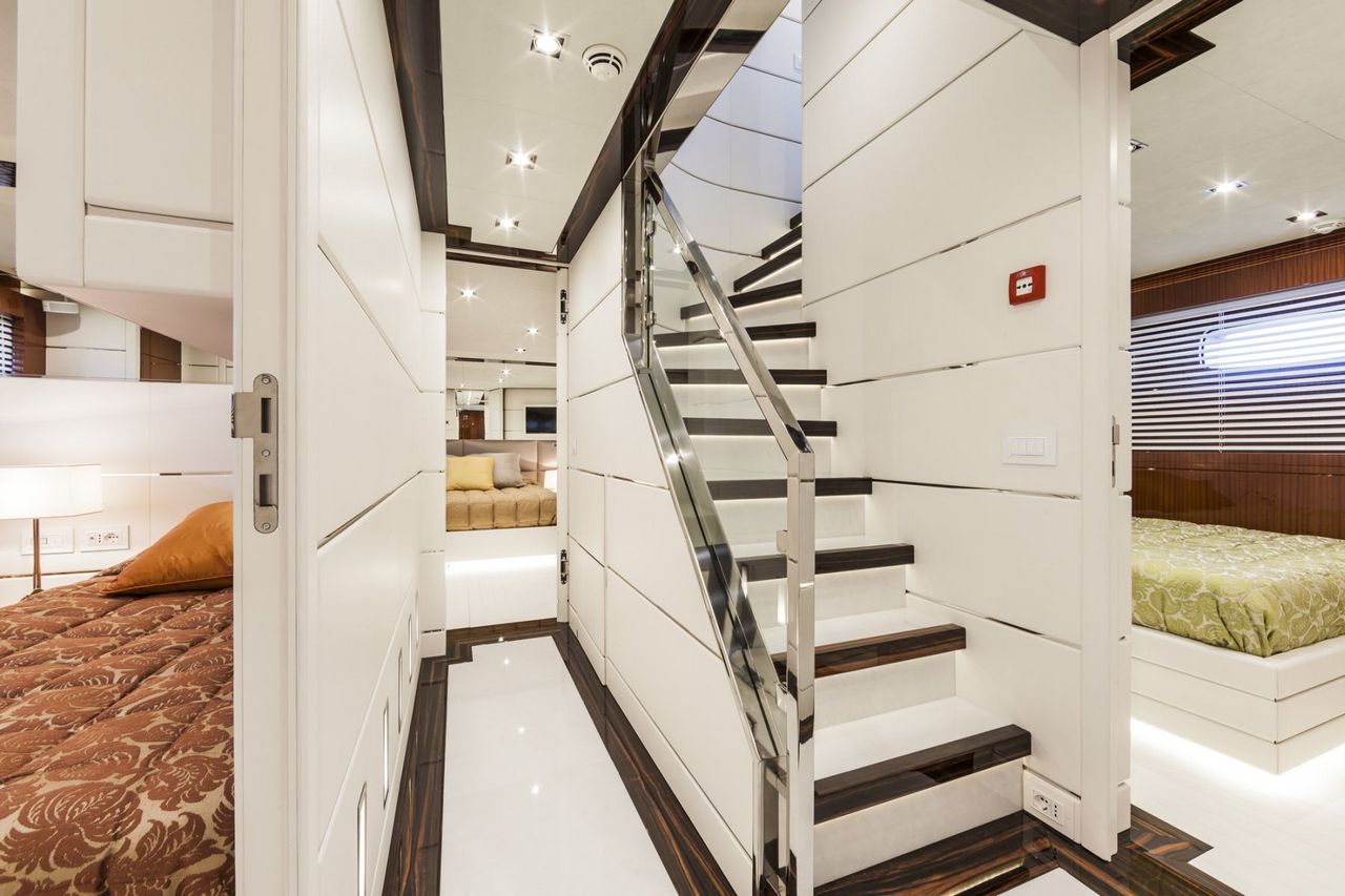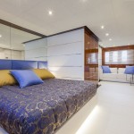 La suite armatoriale si sviluppa a tutto baglio vantando, oltre a un secondo guardaroba, una sala da bagno impreziosita da onici pregiati.