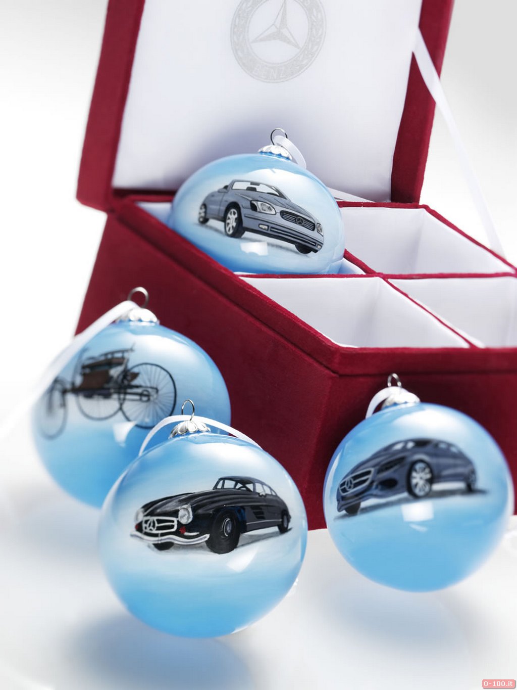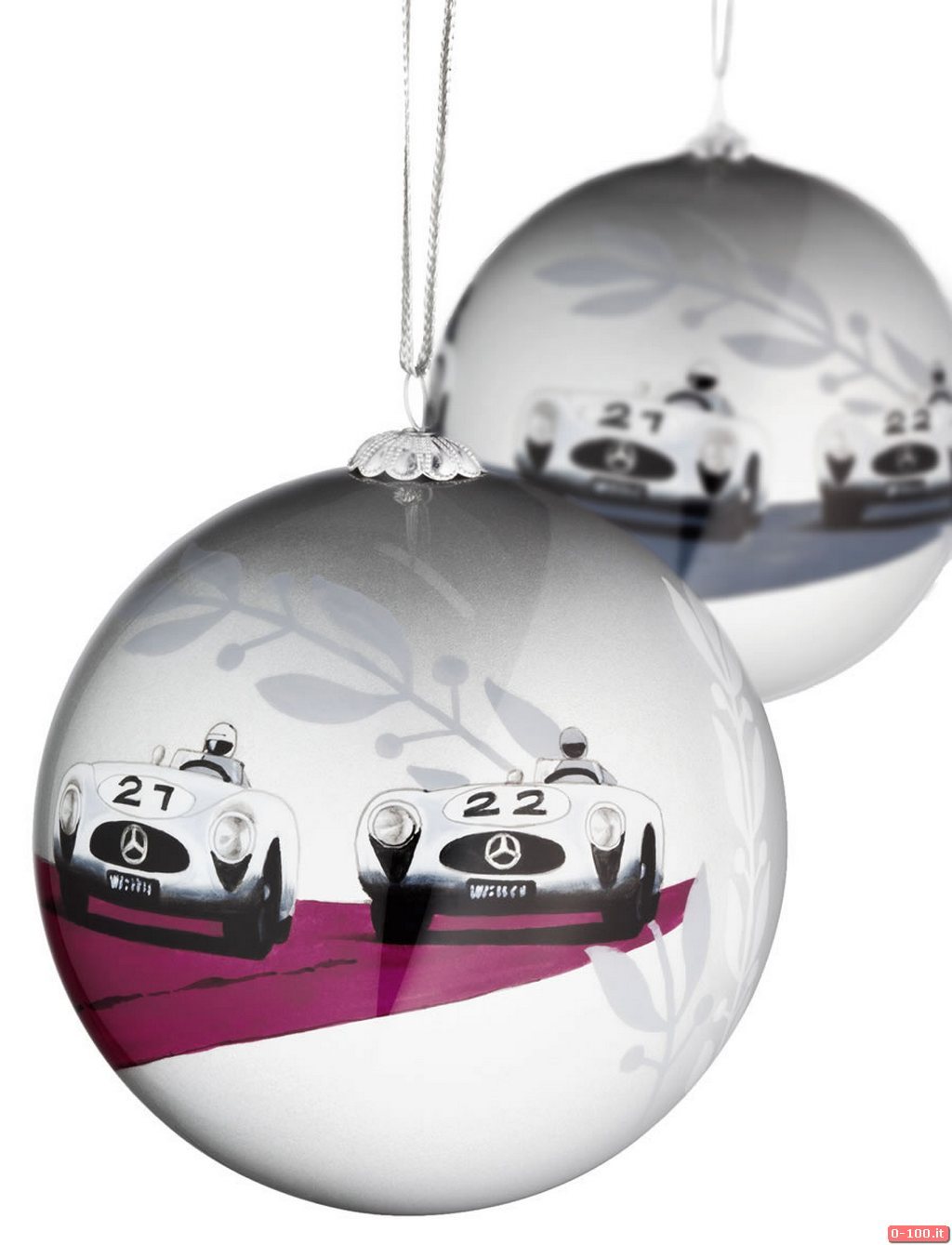Molto fashion le Christmas baubles color grigio per ogni albero di Natale. Il motivo – una gara con due Mercedes 300 SL auto al Nürburgring nel 1952 – è dipinto sul vetro dall’interno. Le palline hanno un diametro di 10 centimetri e sono appese con nastri color argento e disponibili in set di due in una scatola rossa di velluto. Prezzo: 34,90 euro.