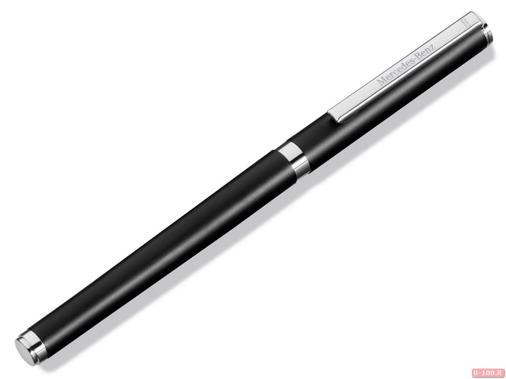 Penna a sfera e roller in metallo cromato color nero opaco prodotte in Germania con una stella incisa nel pulsante, mentre sulla clip è inciso il marchio”Mercedes-Benz”. Prezzi: 29,90 euro per la penna a sfera e di 34,90 euro per la penna roller.