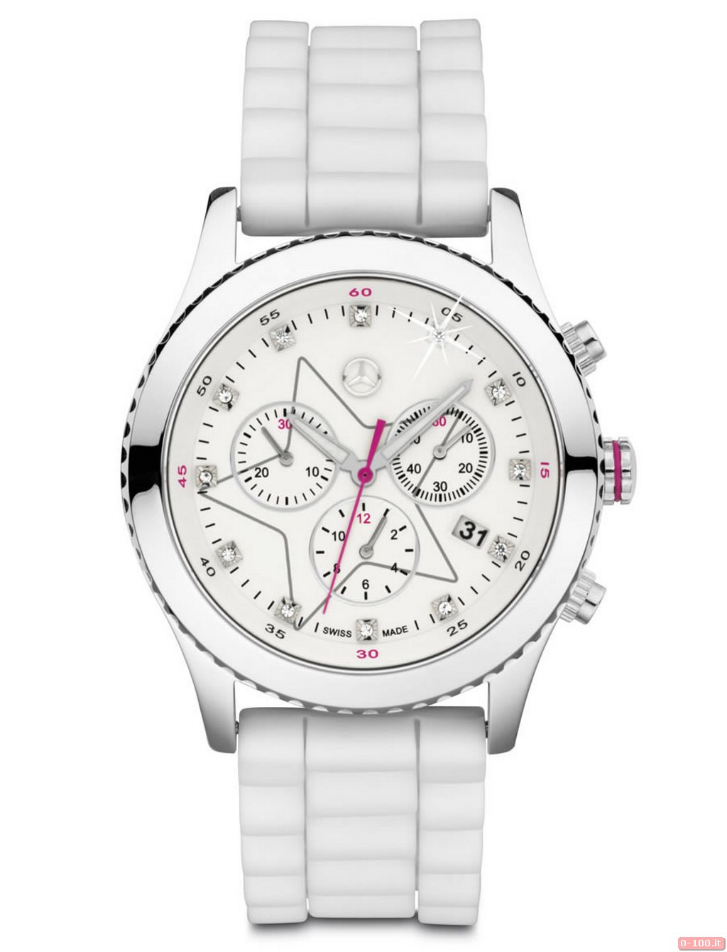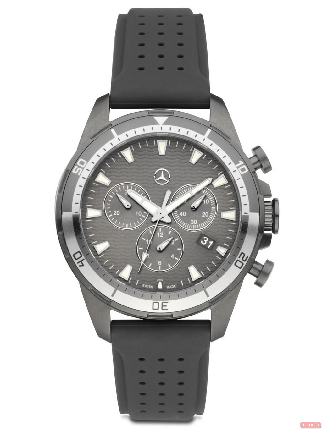 Orologio da polso “Business Style Crono”: cronografo (ore alle 6, minuti alle 9, secondi centrali) con datario realizzato sulla base di una cassa in acciaio inox da 41,5 millimetri, quadrante color antracite sunburst con  movimento al quarzo Ronda 5030, impermeabile fino a 10 ATM. Sul fondello è inciso il marchio”Mercedes-Benz”. Prezzo: 399,90 euro.
