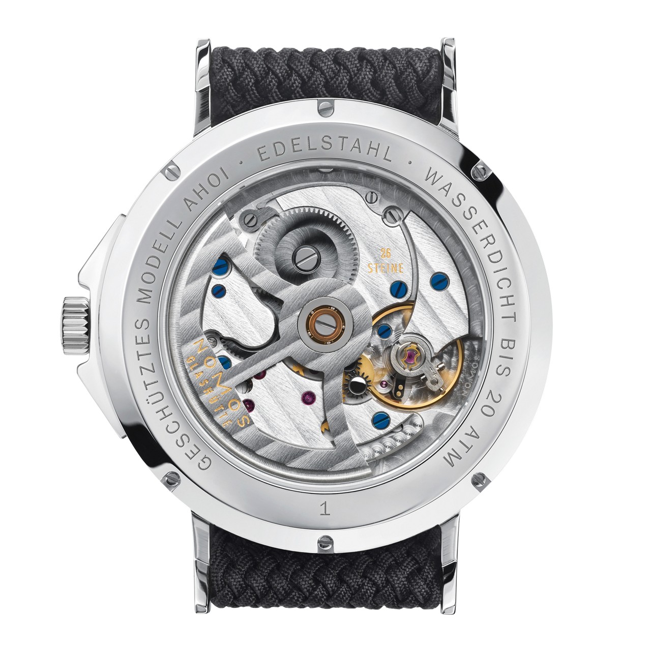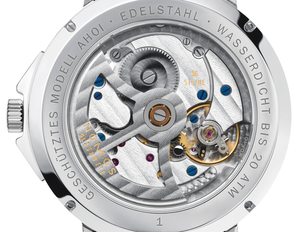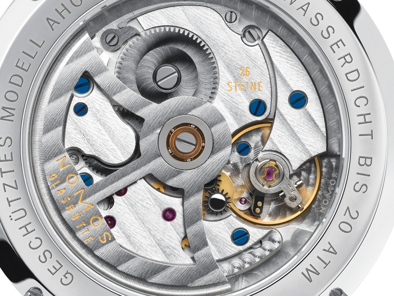 Equipaggiato con il calibro ζ (Zeta) NOMOS di manifattura, batte un movimento meccanico a carica automatica con rotore bidirezionale.