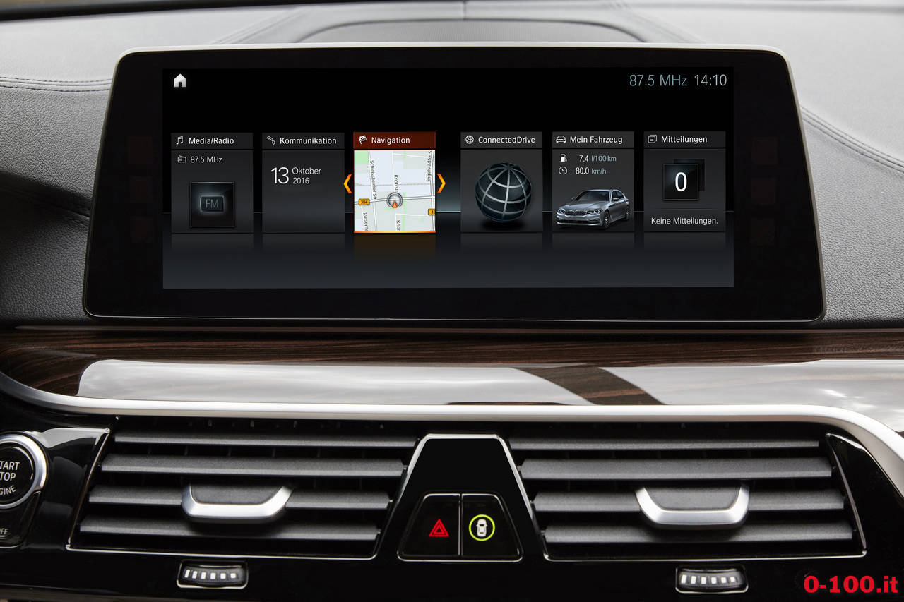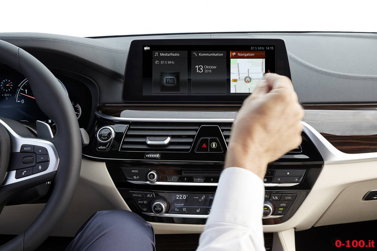 L’interazione tra i passeggeri e l’elettronica di bordo avviene secondo la logica del numero ridotto di controlli sulla plancia. Dalla Serie 7, la nuova Serie 5 riprende il comando gestuale BMW Gesture Control del sistema iDrive di nuova generazione. Nella versione top di gamma navigazione, telefono, intrattenimento e le funzioni della macchina sono visualizzate su uno schermo da 10,25 pollici. I comandi avvengono con l’iDrive Controller, a voce, a gesti oppure sfiorando direttamente le superfici di comando del display. L’entertainment di bordo raggiunge il suo massimo su questo modello con l’inedito sistema audio Surround Sound della Bowers & Wilkins con tweeter con cupola in diamante e 1.400 W di potenza.