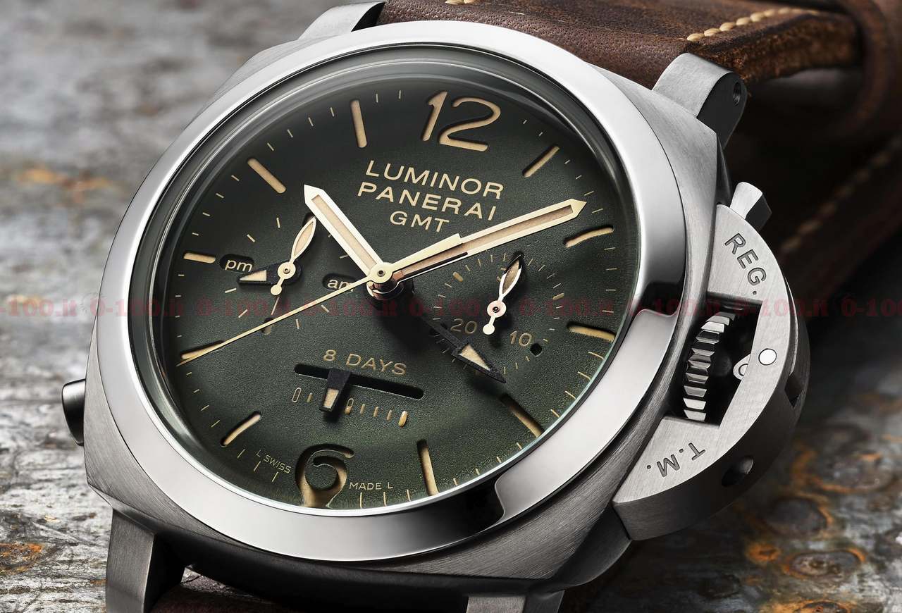 Il Luminor 1950 Chrono Monopulsante 8 Days GMT Titanio, impermeabile fino a 100 metri, è proposto in un box verde in legno di ciliegio al cui interno c’è anche un cinturino di ricambio in caucciù nero, lo strumento per la sostituzione e un cacciavite.