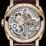 Il nuovo Radiomir 1940 3 Days GMT Oro Rosso è animato dal calibro P.3001/10, movimento meccanico a carica manuale con 72 ore (3 giorni) di autonomia di marcia, doppio bariletto scheletrato, ponti satinati, datario alle 3, funzione GMT (la lancetta centrale a freccia può essere utilizzata per indicare un secondo fuso orario) e indicatore della riserva di carica visibile lato fondello aperto con la possibilità di ammirare lo svolgersi e riavvolgersi della spirale sia in marcia sia durante la carica.