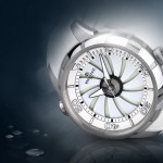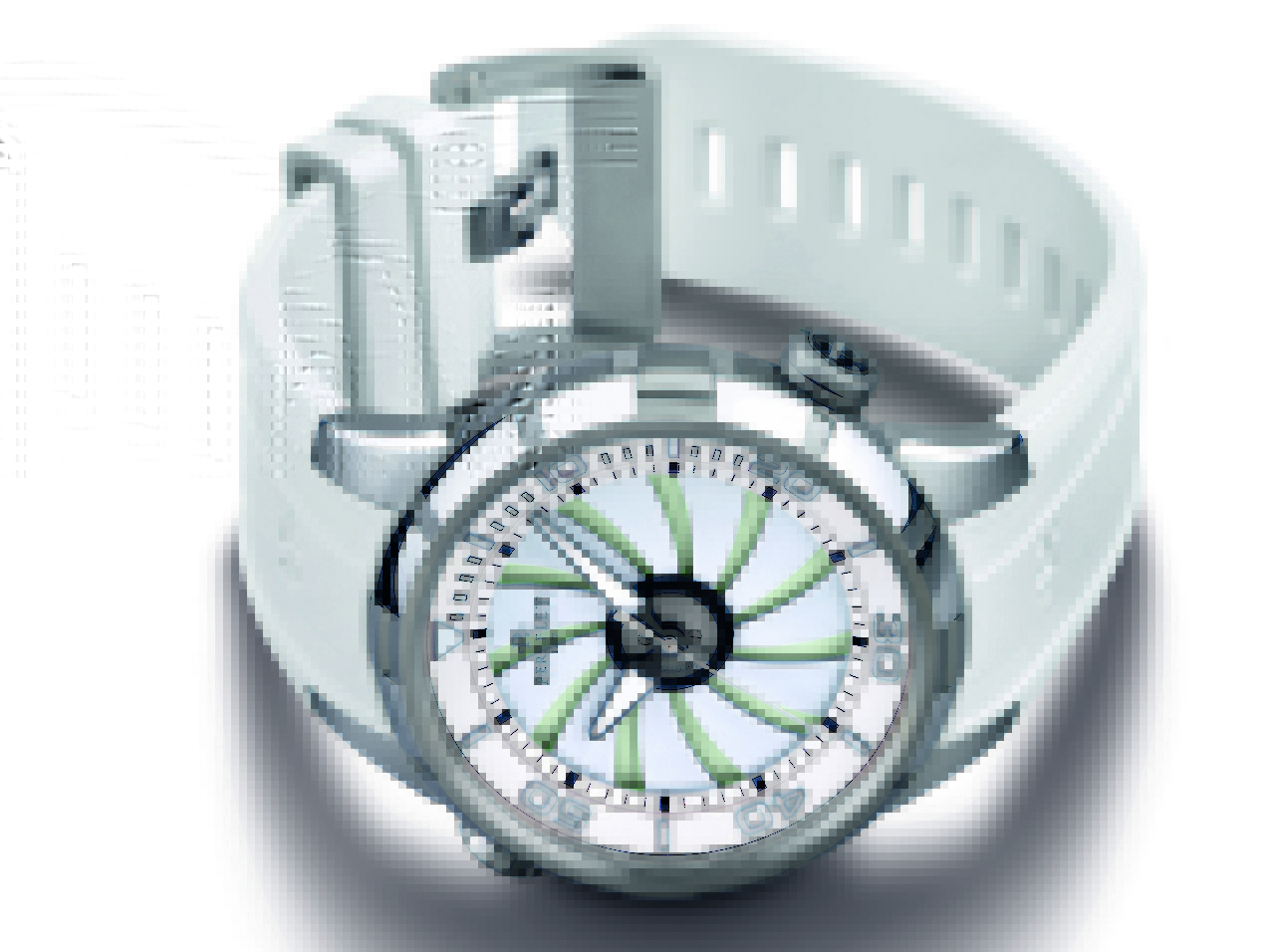 Il quadrante, protetto da cristallo di zaffiro antiriflesso ambo i lati, mostra una turbina con 11 pale in titanio dai contorni vezzosamente arrotondati che ricordano le eliche dei sottomarini.