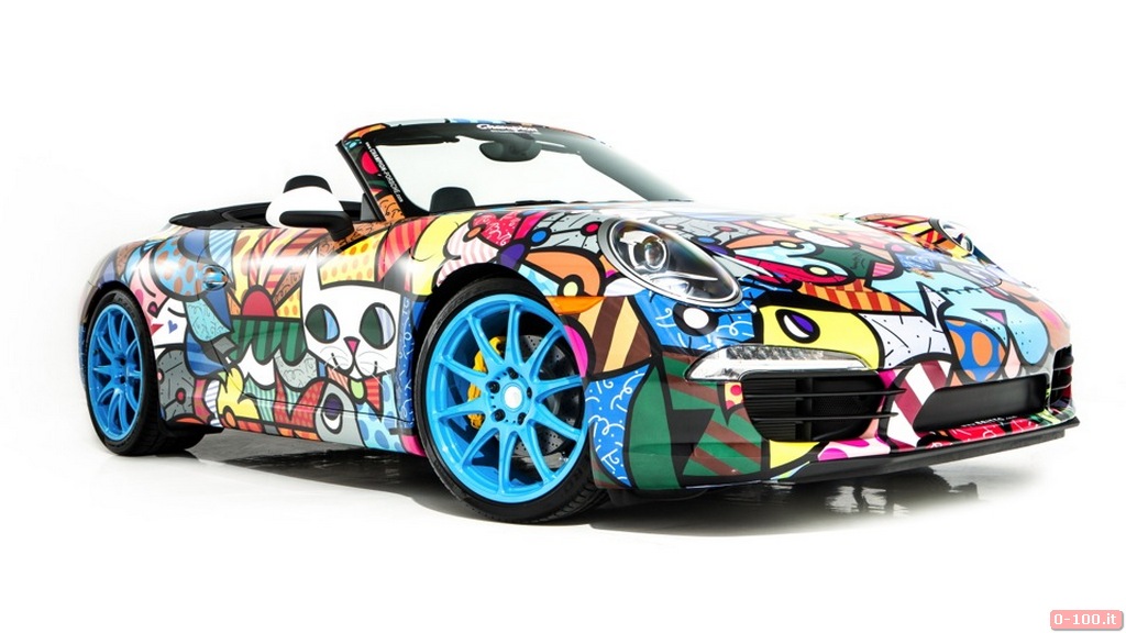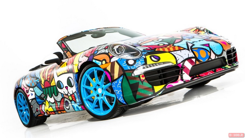 Romero Britto, con un tocco di irriverenza (basta vedere il “di dietro” della 911) ha espresso tutta la sua arte creativa su una Porsche 911 Cabriolet.