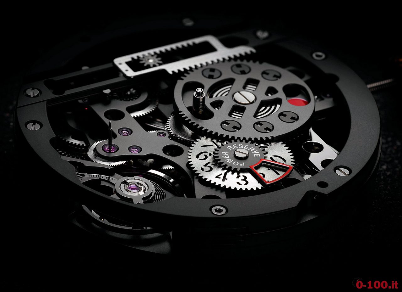L’orologio è mosso è dal calibro di manifattura HUB1201, un meccanismo scheletrato a carica manuale (223 componenti, due bariletti paralleli, scappamento ad ancora svizzera) che batte al ritmo di 21.600 alternanze l’ora e che assicura una riserva di carica di 10 giorni.