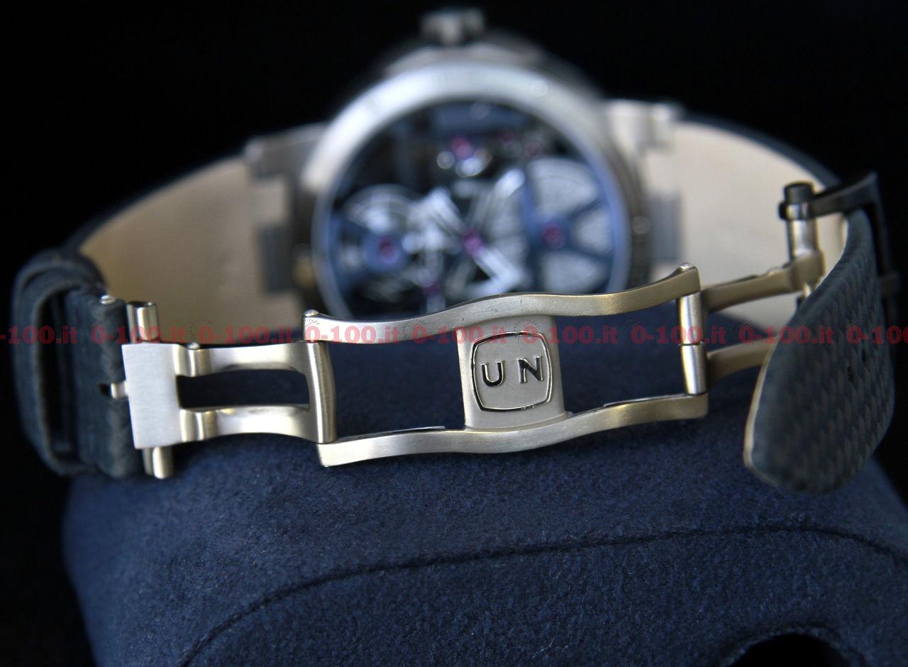 Il suo cuore pulsante è il calibro UN-171 di manifattura; meccanismo scheletrato a carica manuale con ponte rettangolare sollevato, ruota dello scappamento e spirale in silicio. Batte al ritmo di 18.000 alternanze l’ora, offre le indicazioni di ore, minuti e tourbillon volante e garantisce un‘autonomia di marcia a carica completa di 7 giorni (170 ore).