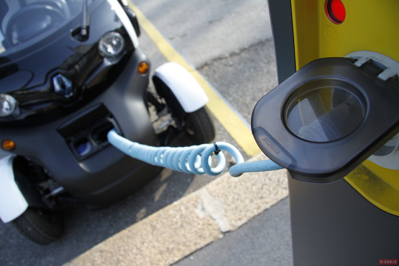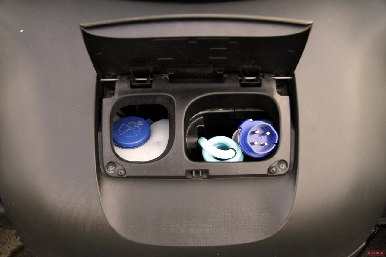 Le batterie della Renault Twizy si ricaricano in 3 ore e mezza. Sul musetto un piccolo sportello permette di accedere a un vano con la spina, che può essere agganciata a una qualsiasi presa di corrente da 220 V.