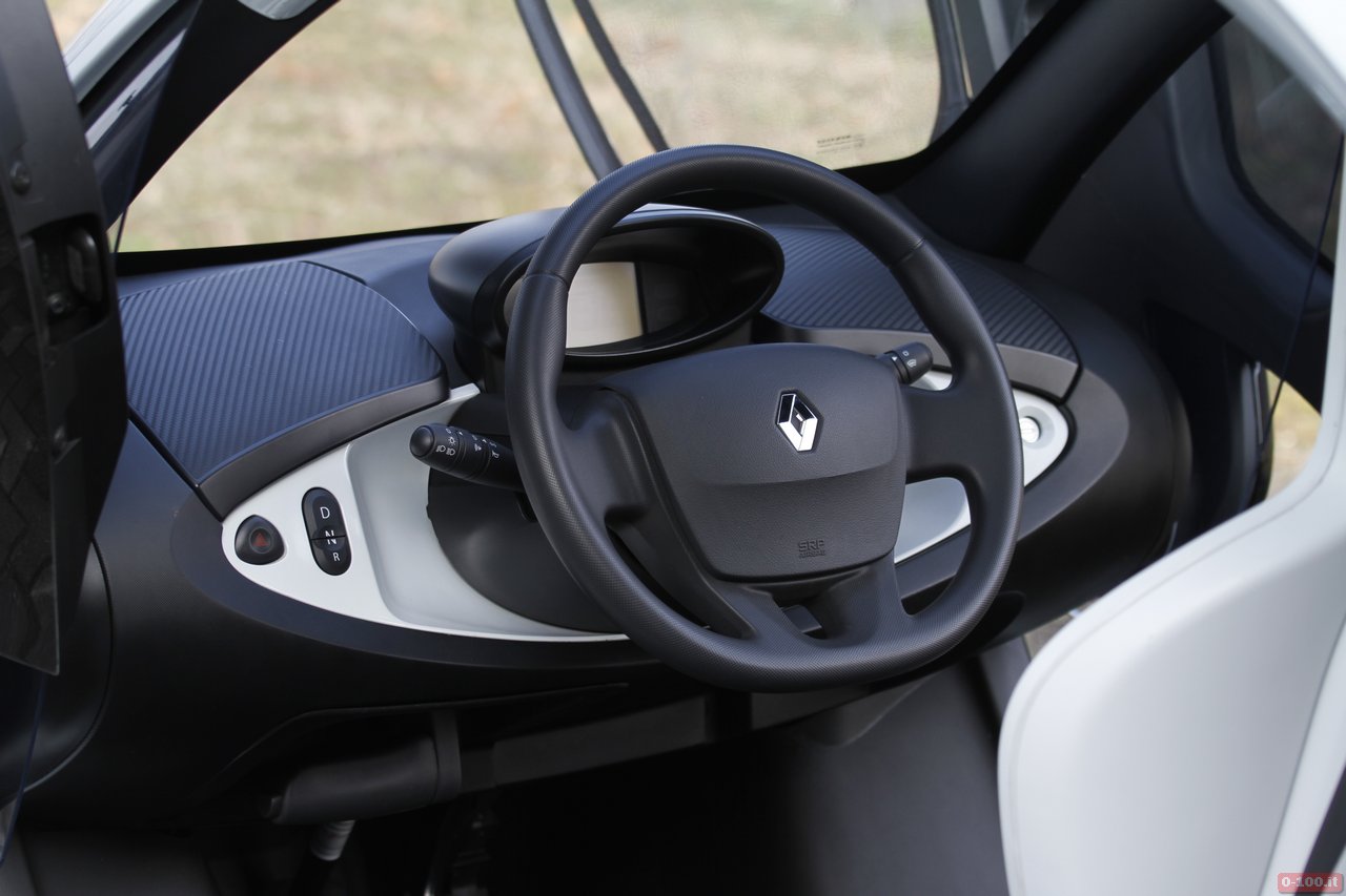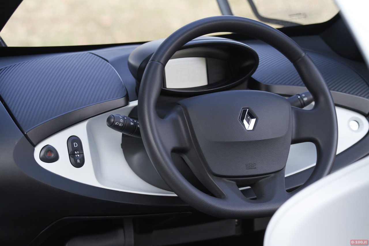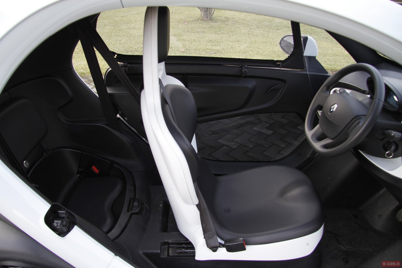 L’abitacolo della Renault Twizy ha il posto guida centrale, con ai lati adeguato spazio per appoggiare la 24 ore come le borse della spesa. Il sedile, regolabile in senso longitudinale, ha lo schienale fisso ed è abbastanza comodo sebbene, essendo in gomma rigida, in estate può causare qualche problema di sudorazione.