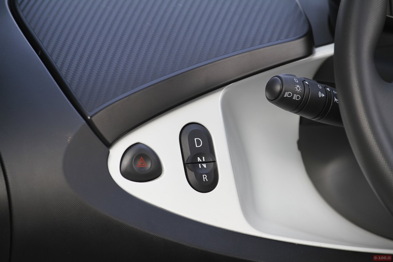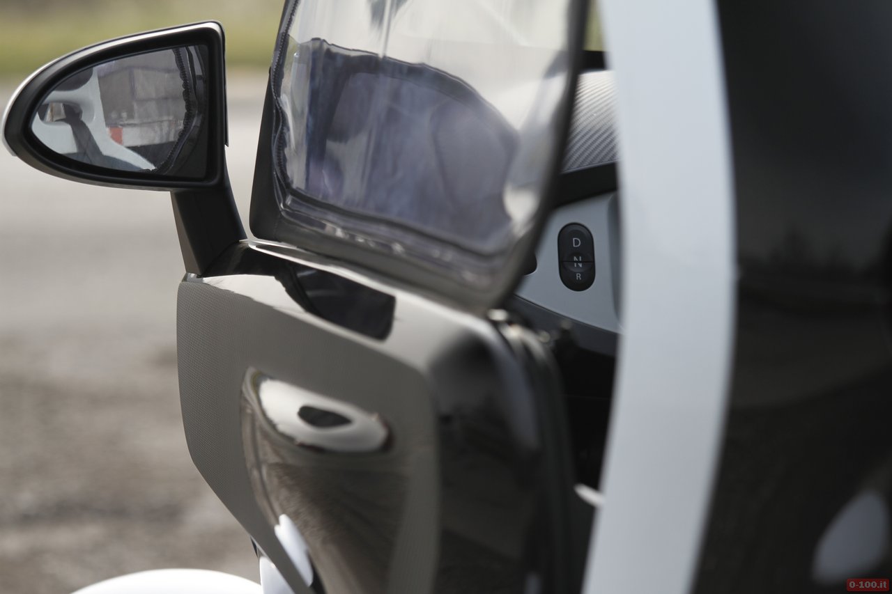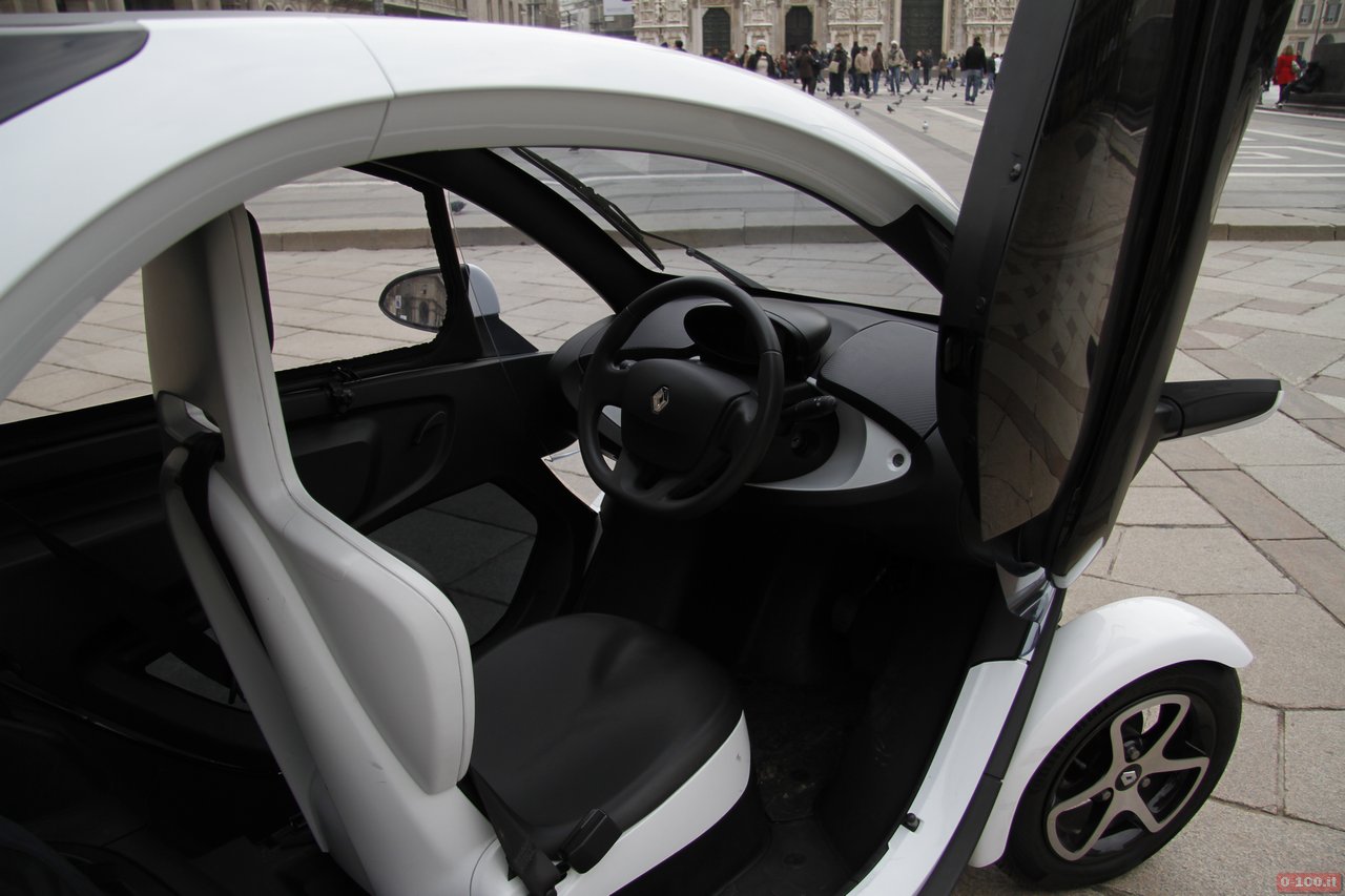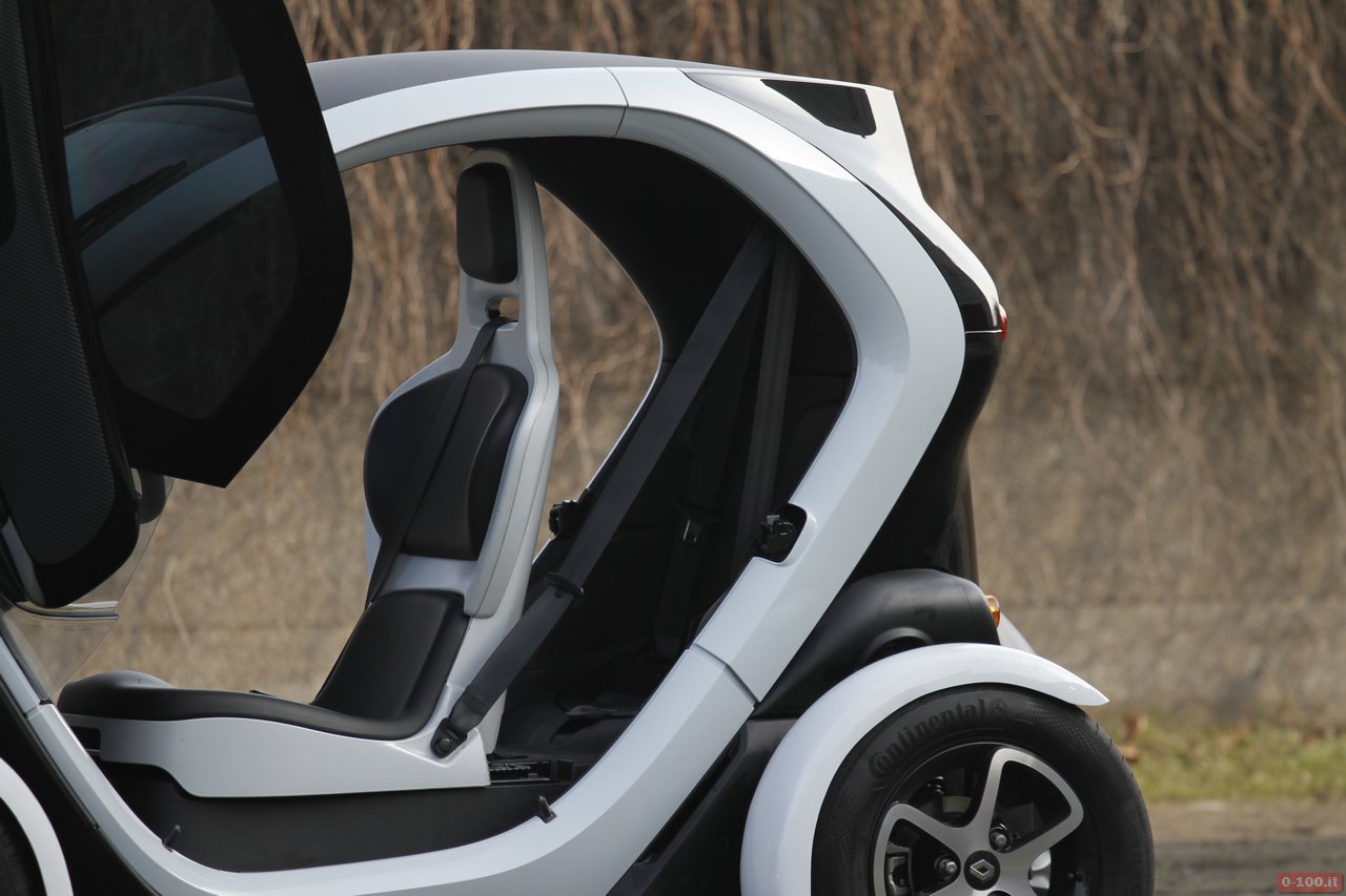 L’abitacolo della Renault Twizy ha il posto guida centrale, con ai lati adeguato spazio per appoggiare la 24 ore come le borse della spesa. Il sedile, regolabile in senso longitudinale, ha lo schienale fisso ed è abbastanza comodo sebbene, essendo in gomma rigida, in estate può causare qualche problema di sudorazione.