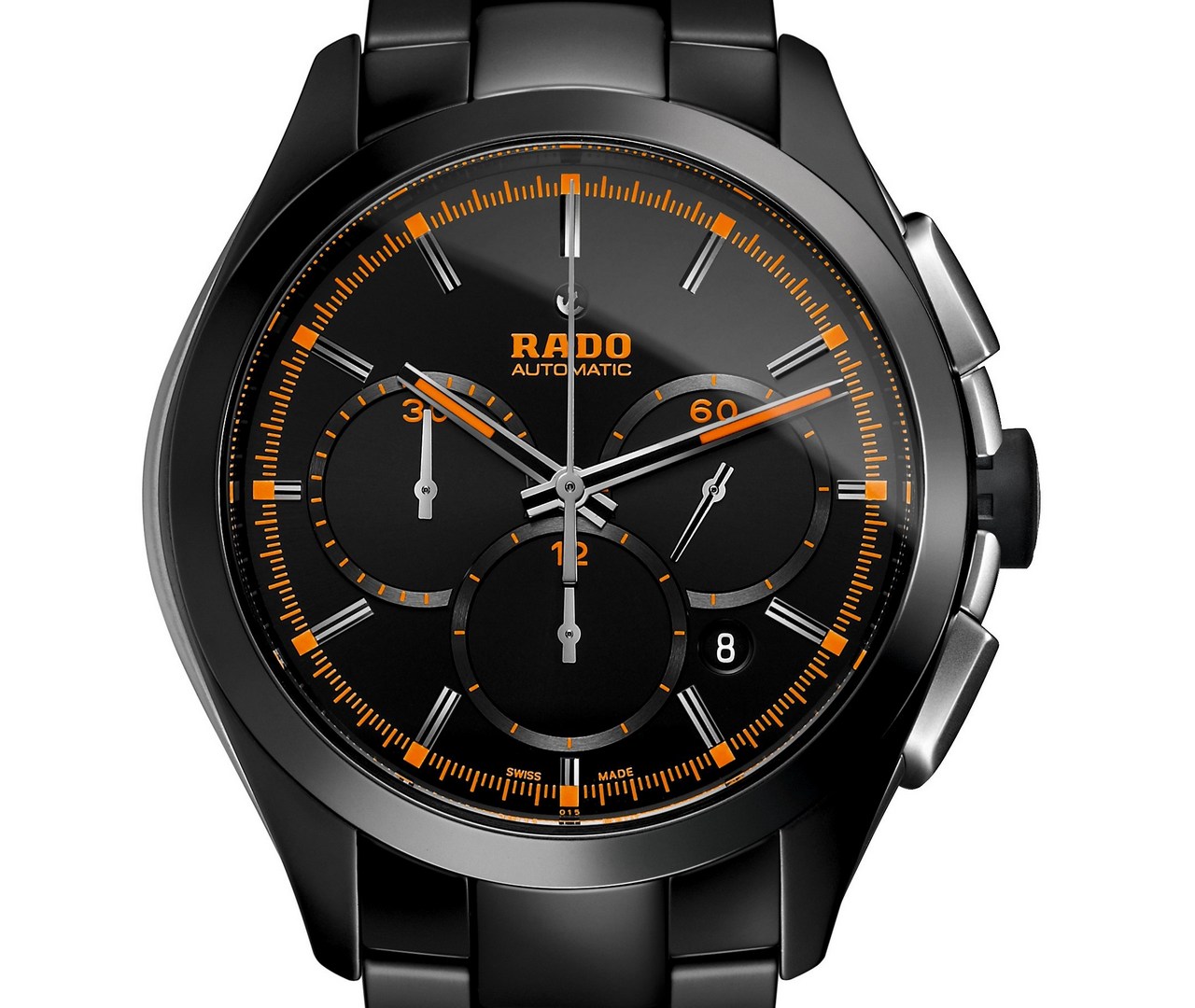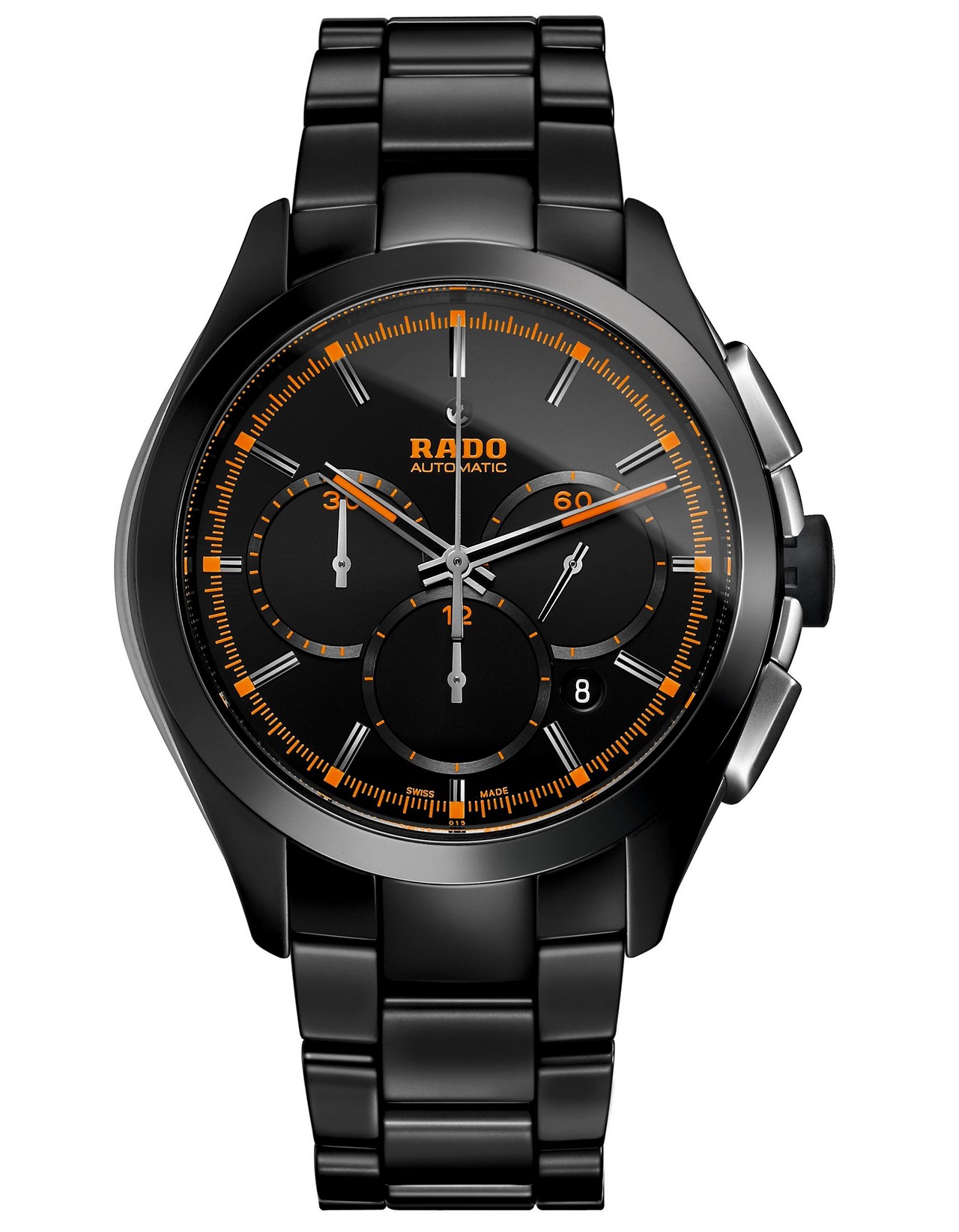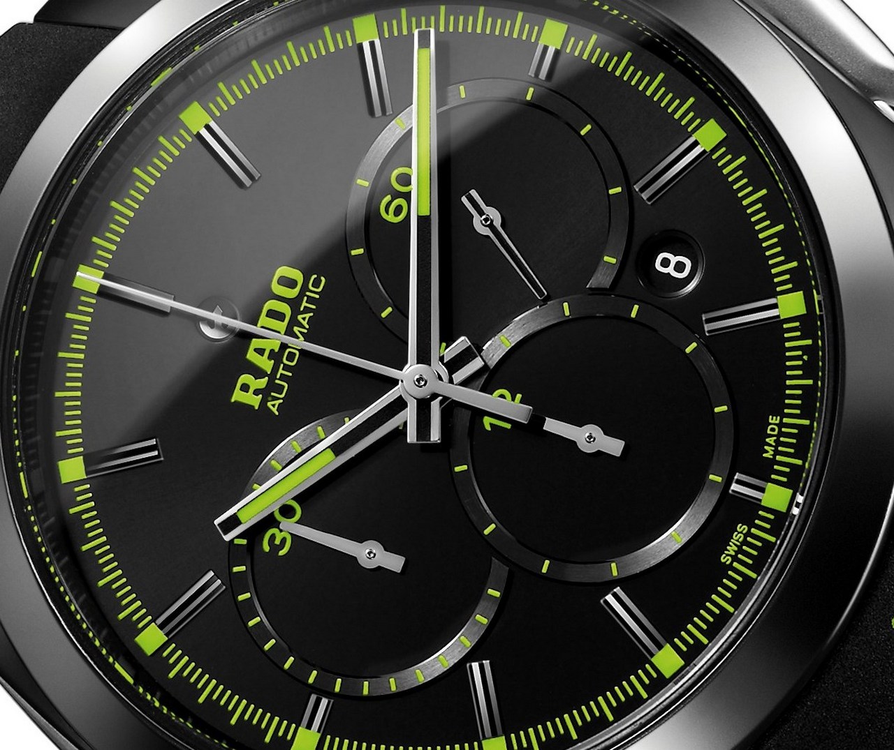 Meccanico a carica automatica personalizzato Rado, questo accattivante segnatempo vanta 37 rubini, datario tra le ore 4 e 5, riserva di carica di 42 ore, massa oscillante nera, secondi continui a ore 3, 12 ore a ore 6 e minuti cronografici a ore 9.
