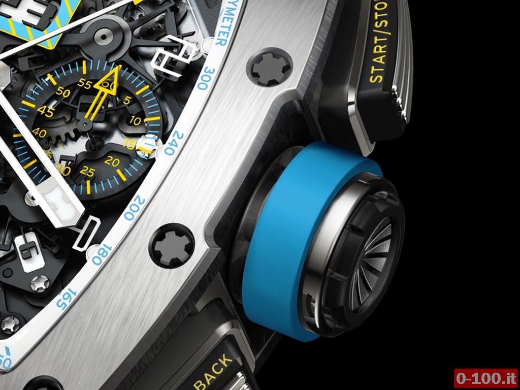 Sul quadrante scheletrato (racchiuso in una cassa tonneau in titanio da 50 x 40 mm per la quale sono necessarie oltre 200 lavorazioni manuali) sono riportati anche il contatore dei minuti (alle ore 3) e i secondi continui (ore 9). Lancette e contatori riportano la colorazione giallo/azzurro di cordoli del circuito di Le Mans.