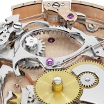 Questo segnatempo vanta anche il meccanismo di ripetizione minuti che consente di conoscere l’ora anche al buio. Su questo modello non è coperta dal quadrantein modo da poter ammirare il delizioso meccanismo di suoneria in funzione.
