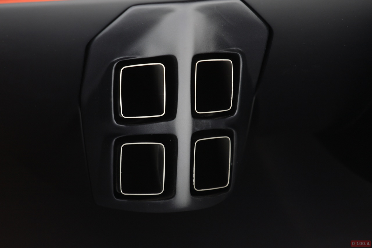 La sua forma definitiva la cogli soprattutto di lato: un immenso arco ricco di pinne e superfici che lo equilibrano su strada. Il lungo muso sembra ora uno uno spazzaneve ora una grande bocca che ingoia asfalto. L‘immensa coda ricorda il rendering di uno scontro di particelle degli esperimenti del CERN di Ginevra.