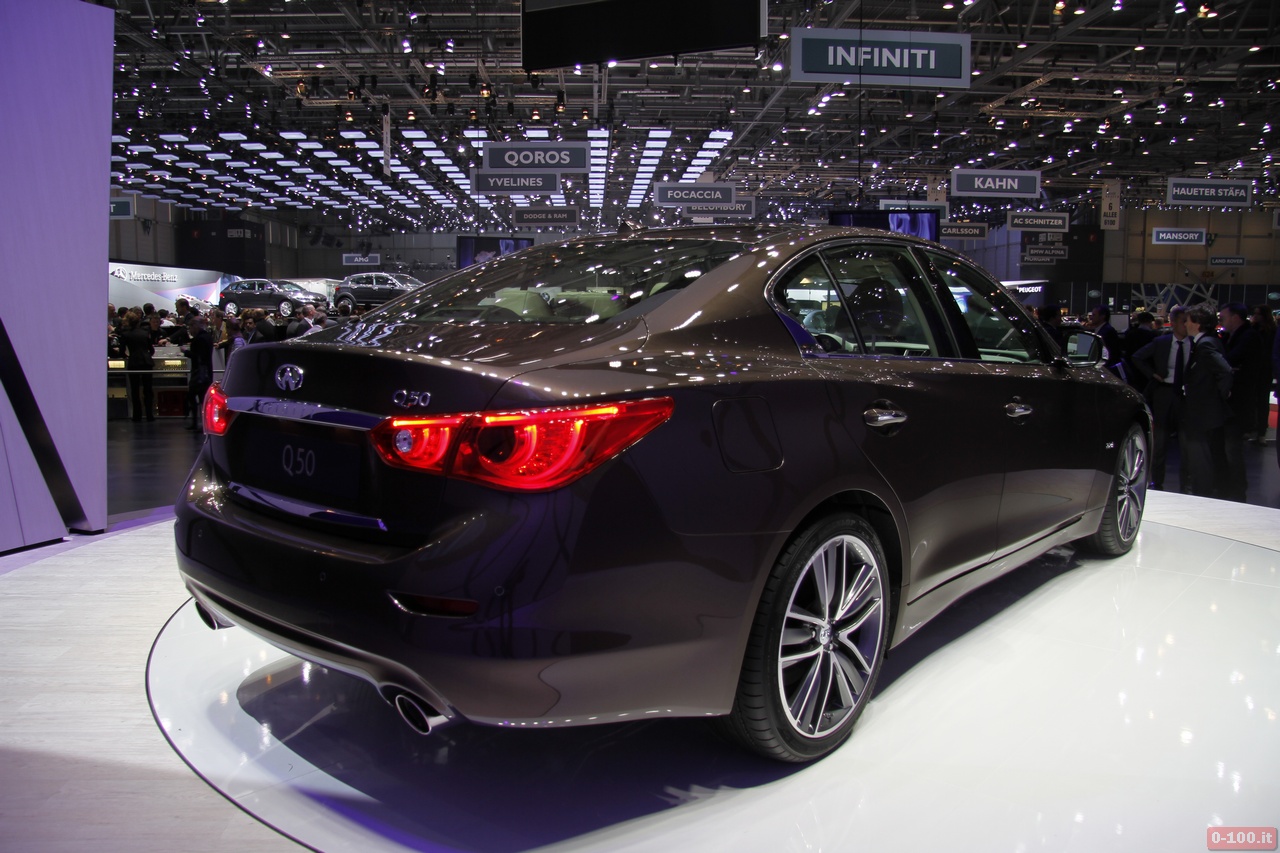 Introdotta in gennaio in prima mondiale al NAIAS 2013 di Detroit, esordiva in quella sede in versione ibrida: la Q50 Hybrid è equipaggiata con un V6 3.5 da 302 Cv abbinato a un motore elettrico da 62 Cv. Il totale fa 364 Cv per prodursi sullo 0-100 in soli 5″5. Arriverà in Europa il prossimo autunno.
