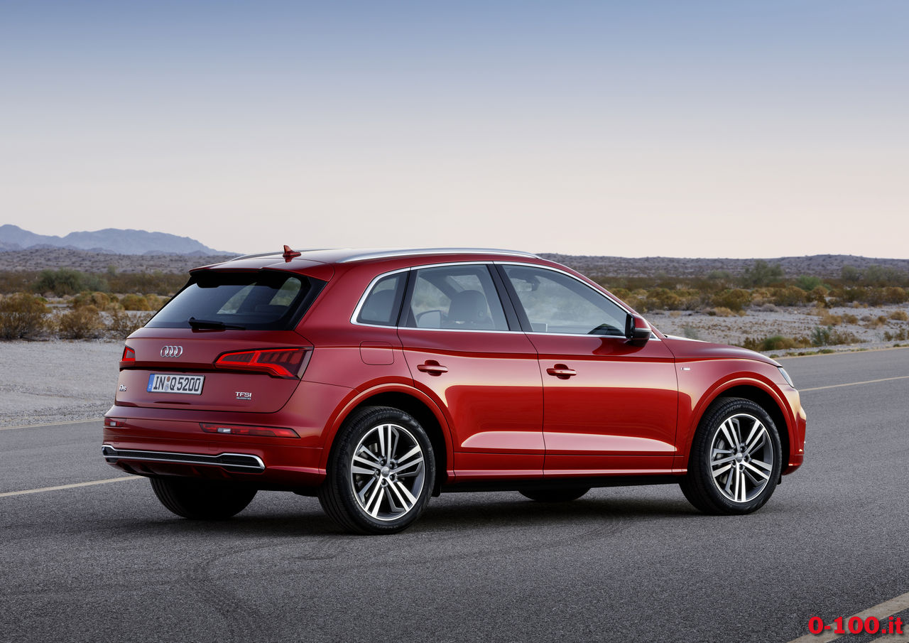 E’ lunga 4,66 metri, larga 1,89, alta 1,66 e con un passo di 2,82 metri. Globalmente le misure sono aumentate ma il peso è diminuito, mediamente, di 90 kg per l’uso di alluminio e leghe speciali. Nello stesso tempo è leggermente aumentato anche lo spazio interno: il vano bagagli ha una capienza iniziale compresa tra 550 e 610 litri secondo la posizione della seconda fila di sedili (10 in più rispetto alla precedente Q5) e può arrivare fino a 1.550 litri.