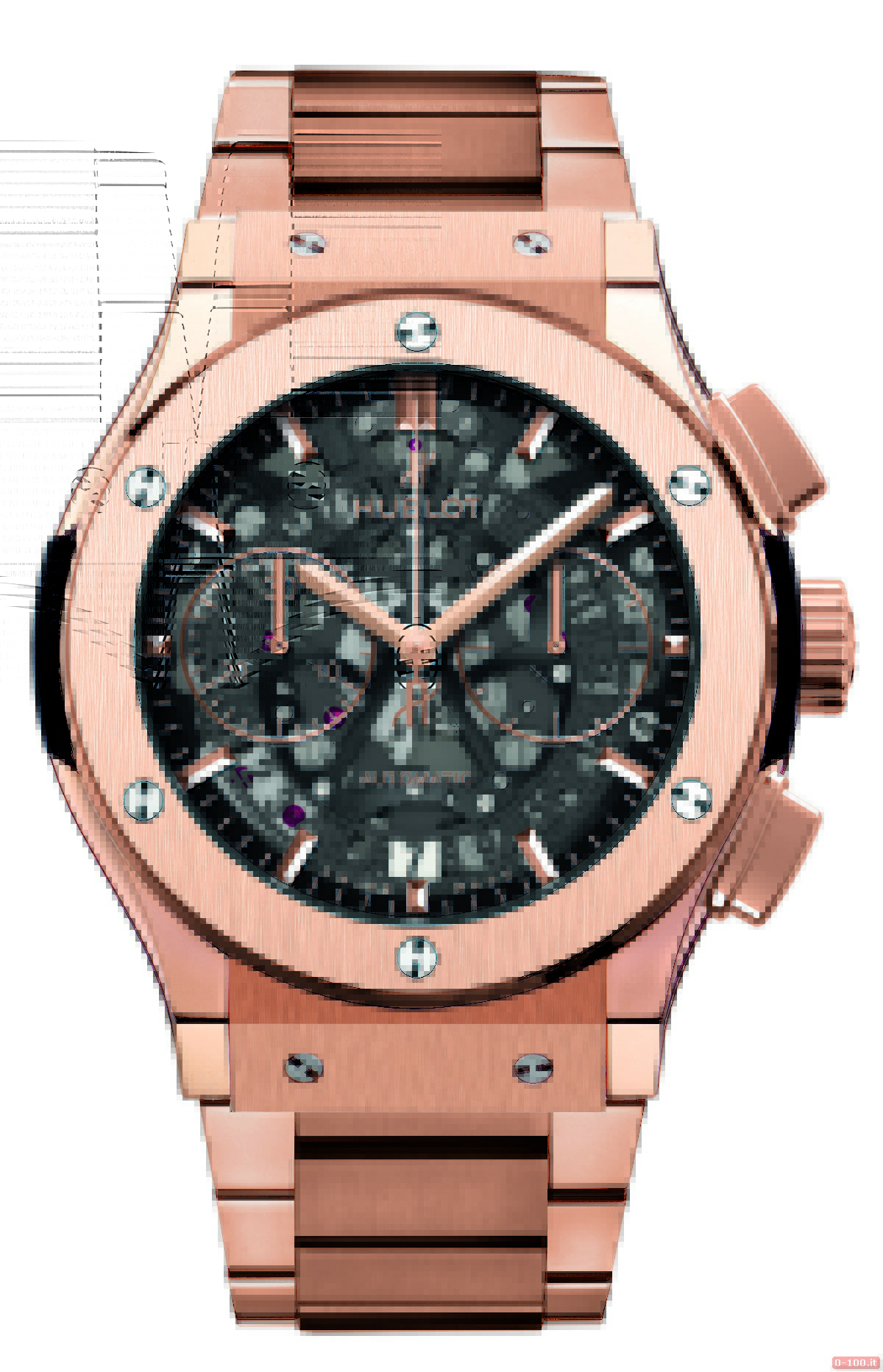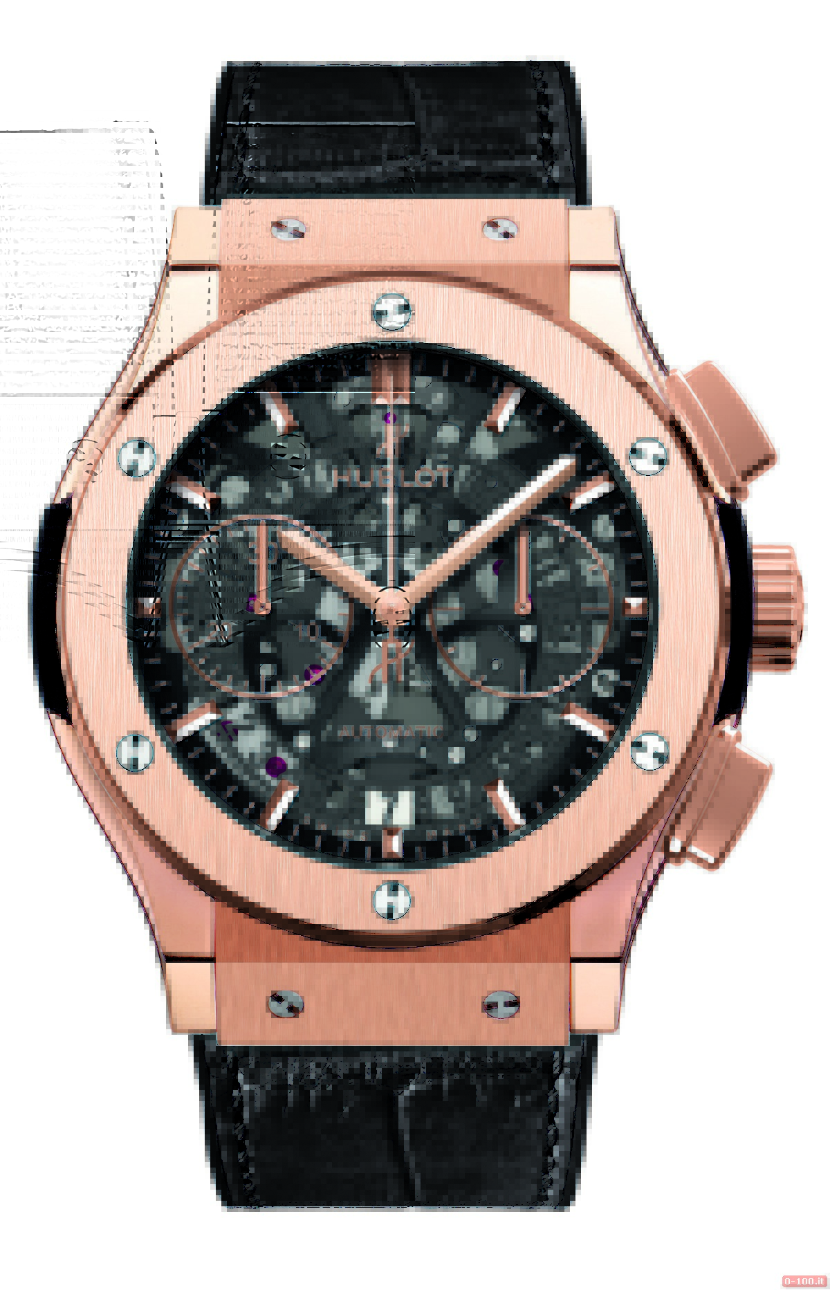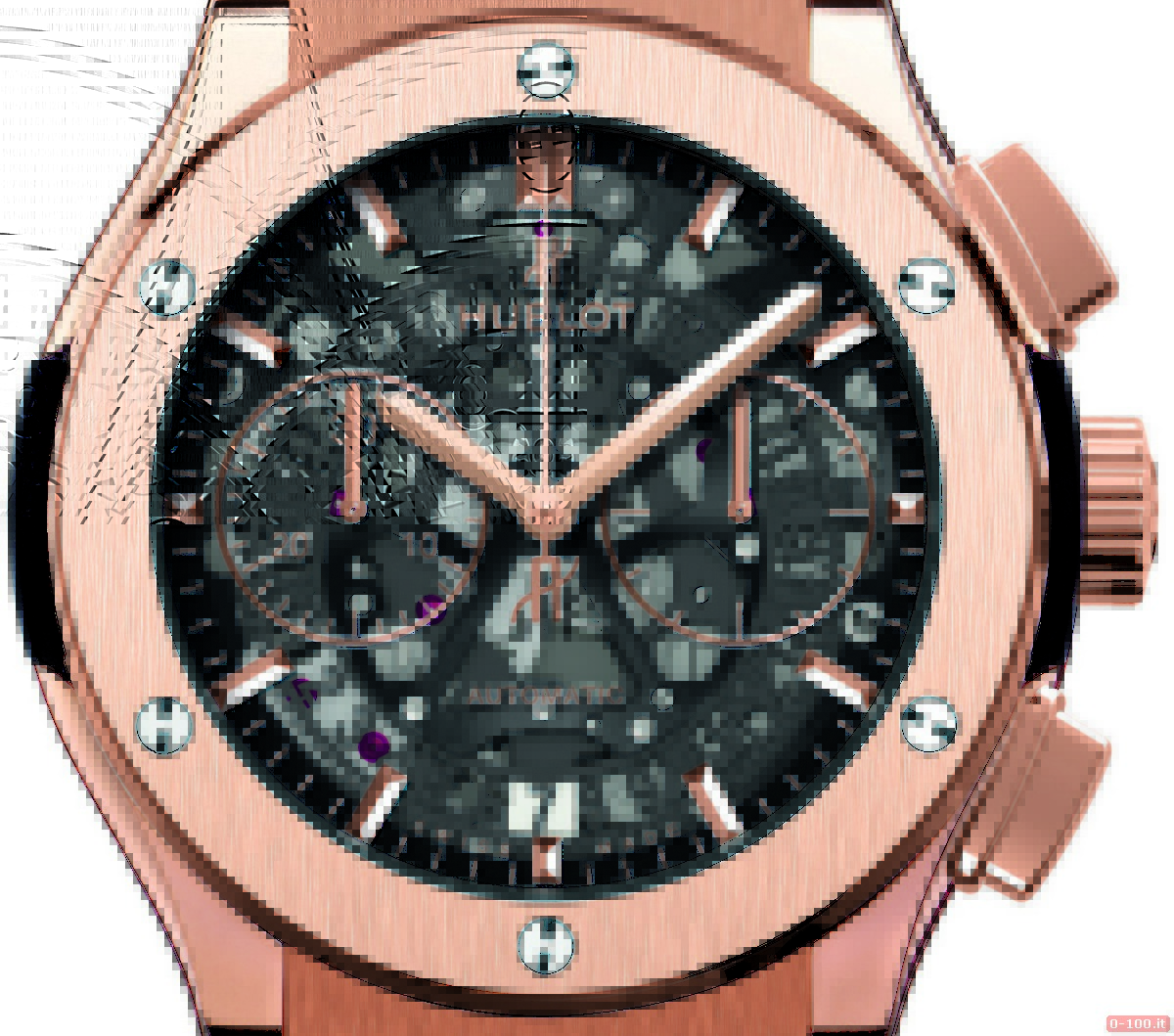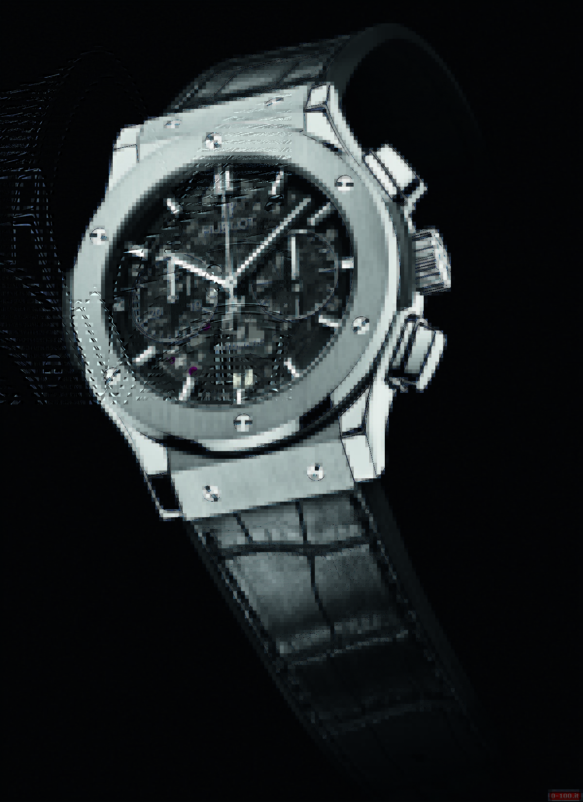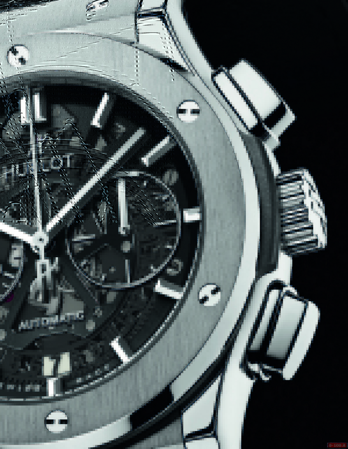 L’elegante cronografo monta il calibro HUB 1155 di manifattura, meccanico a carica automatica (207 componenti, 60 rubini, massa oscillante in carburo di tungsteno rodiato con logo Hublot, ponti rivestiti in nero e riserva di carica di circa 42 ore).