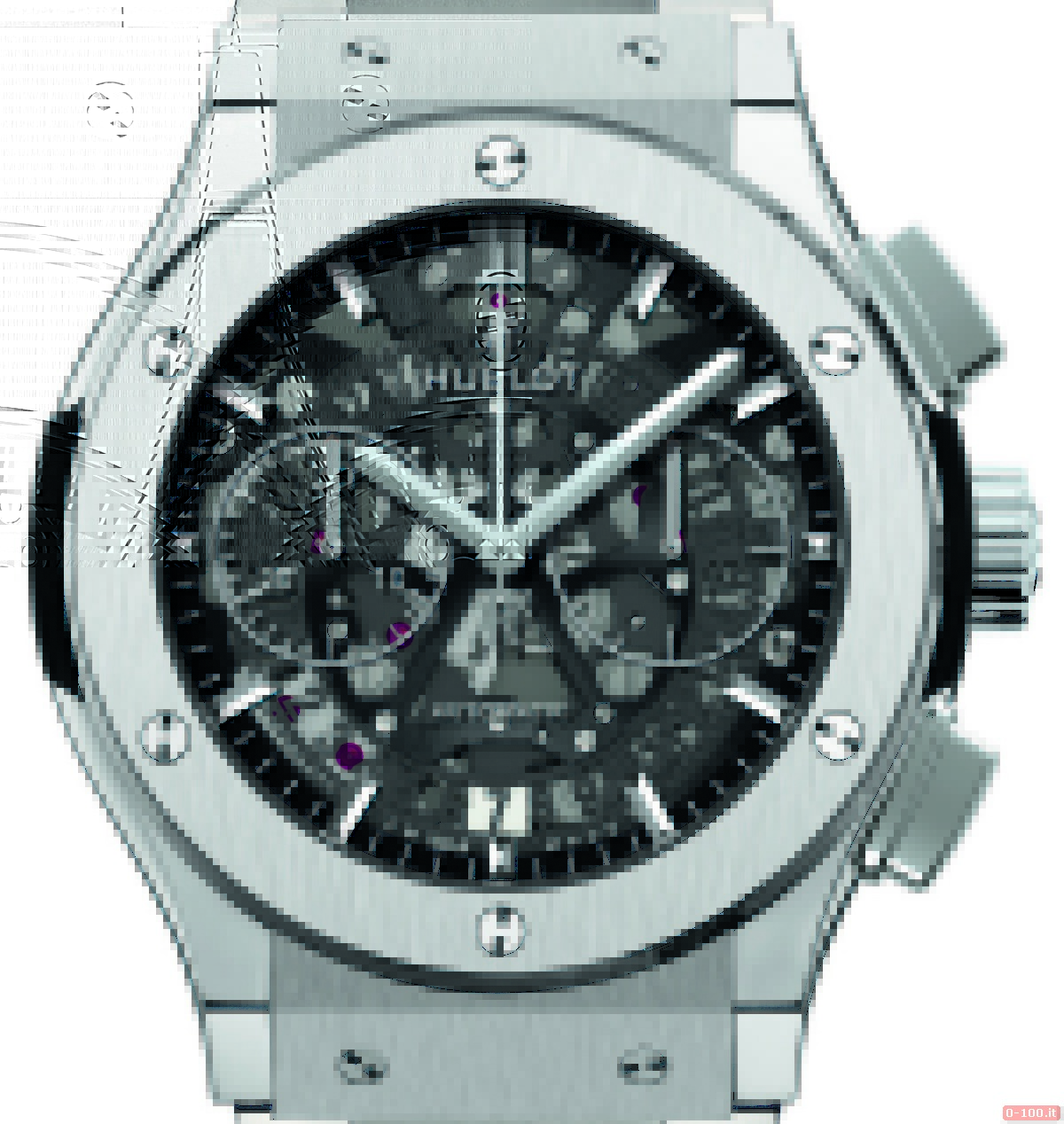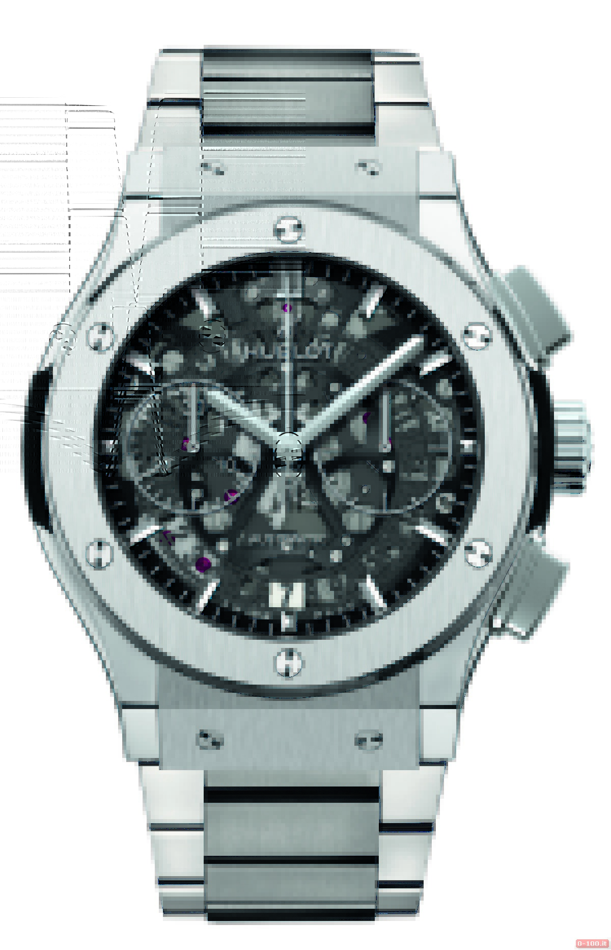 Il Chrono Aero ha: due pulsanti in titanio o King Gold 18 kt sul lato della corona in titanio lucidato o oro 18 kt con logo Hublot, due contatori circolari a ore 3 (piccoli secondi) e 9 (minuti continui) e un datario visibile, grazie al quadrante Skeleton, a ore 6.