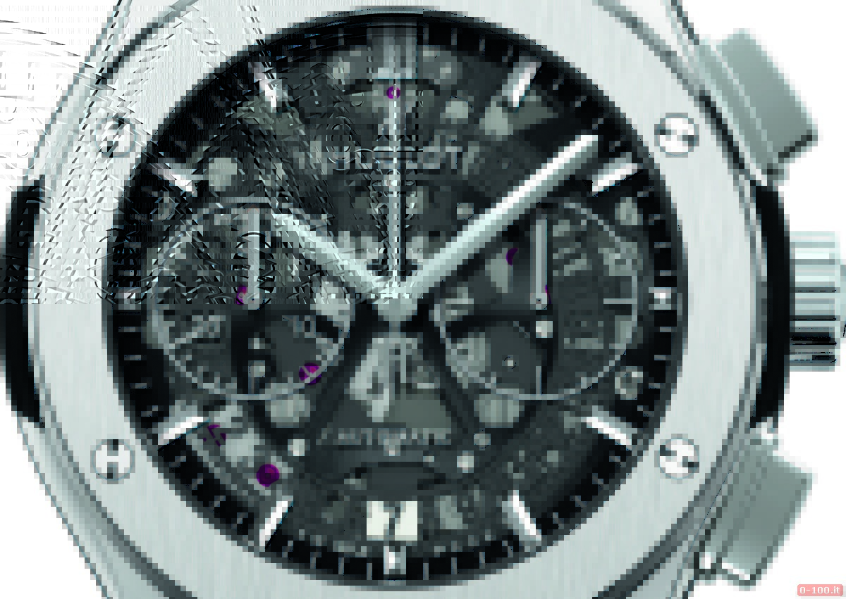 Protetto da vetro zaffiro antiriflesso su entrambi i lati, l’ Hublot Classic Fusion Chrono Aero ha il fondello in titanio satinato o King Gold 18 kt ed è impermeabile fino a -50 metri.