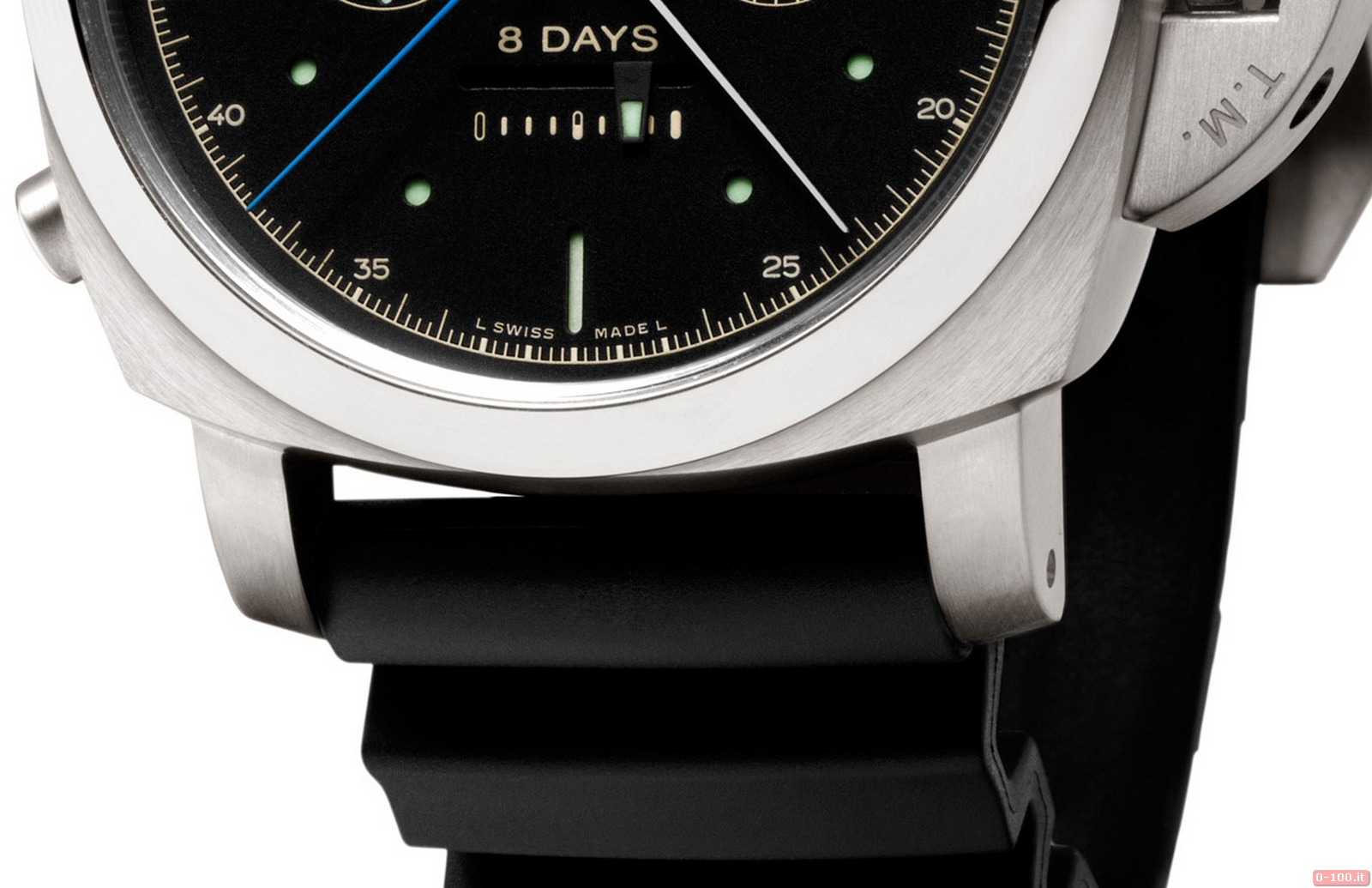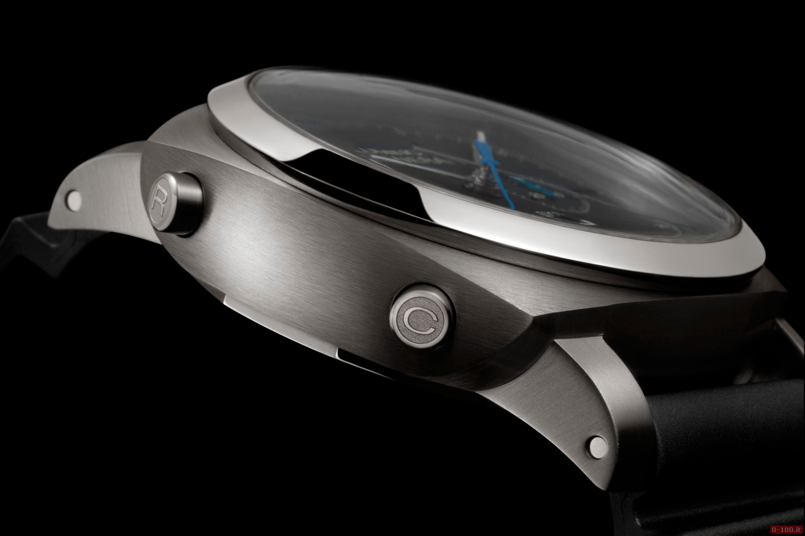 Il cronografo grazie anche al dispositivo proteggi corona (brevettato) in titanio satinato, è impermeabile fino a – 100 metri e ha doppio cristallo di zaffiro, corindone anti-riflesso di 2 mm di spessore lato quadrante e lato fondello.