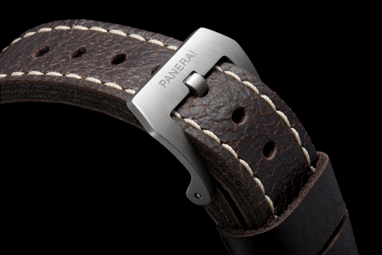 Con fondello a vista in vetro zaffiro, il segnatempo, impermeabile fino a -300 metri circa, è provvisto di cinturino in cuoio e fibbia trapezoidale in titanio satinato personalizzati Panerai.