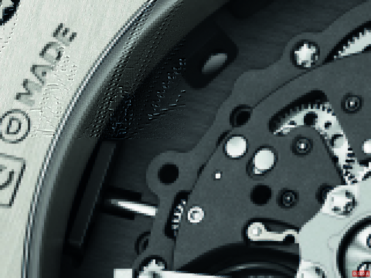 Il movimento, con circa 50 ore di riserva di carica grazie a 2 bariletti, ha platina, ponti e sostegno del bilanciere in titanio grado 5. E’ alloggiato all’interno di una complessa cassa in titanio, formata da 4 parti, da 50 mm di diametro e 16,3 di spessore.