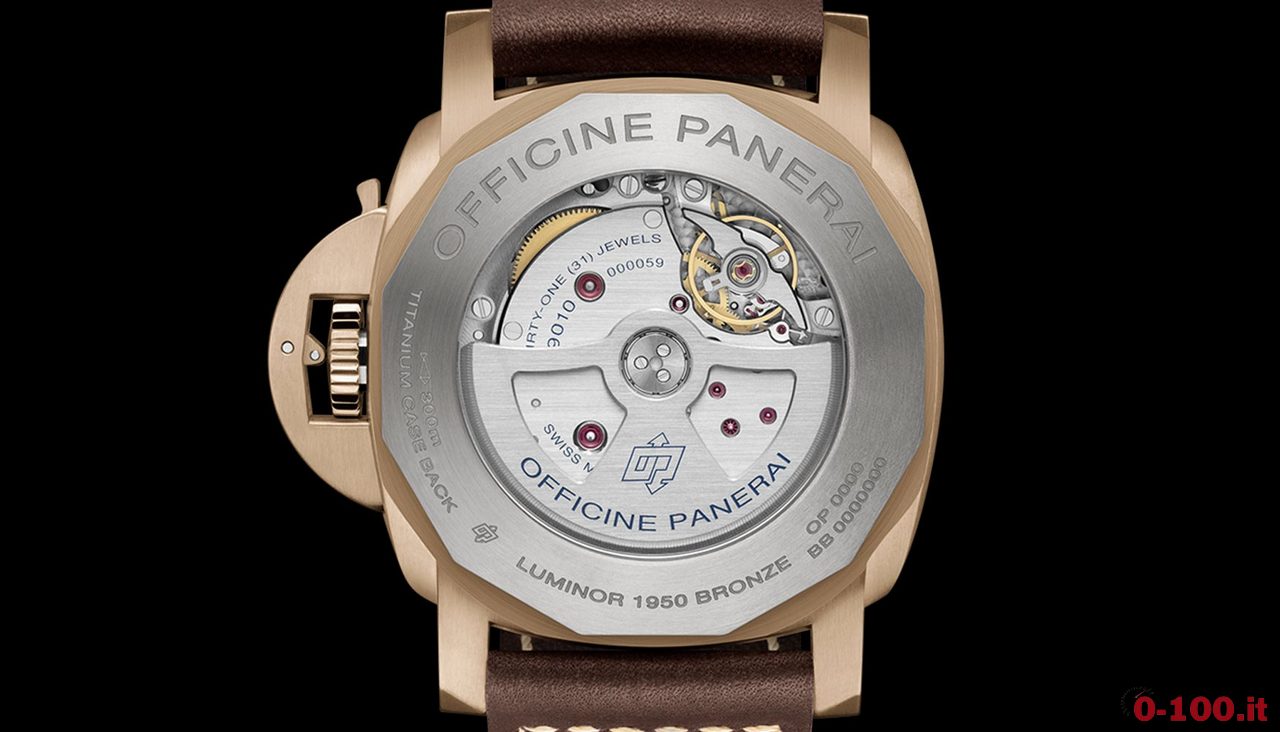 La cassa Luminor 1950 (47 mm) di questo orologio da immersione, così come il tradizionale dispositivo proteggi-corona e la lunetta girevole unidirezionale in senso antiorario con scala graduata per il calcolo dei tempi di immersione, è in bronzo.