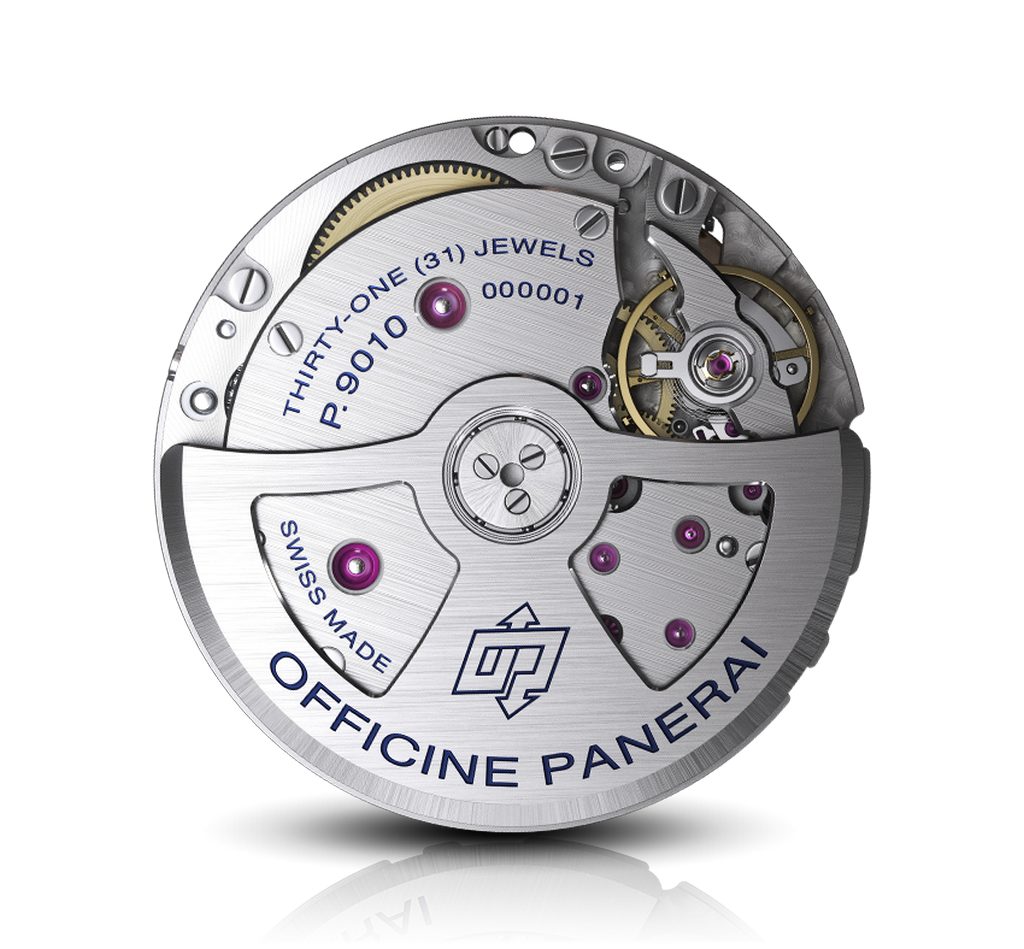 Il cuore pulsante del PAM00671, che sfoggia un quadrante blu a ricordare le profondità marine con indici e punti luminescenti, è il calibro automatico P.9010 di manifattura (200 componenti, bilanciere in Glucydur, 28.800 alternanze/ora, dispositivo antiurto Incabloc, due bariletti e riserva di carica di 3 giorni). Offre le indicazioni di ore, minuti, piccoli secondi al 9 e datario al 3.