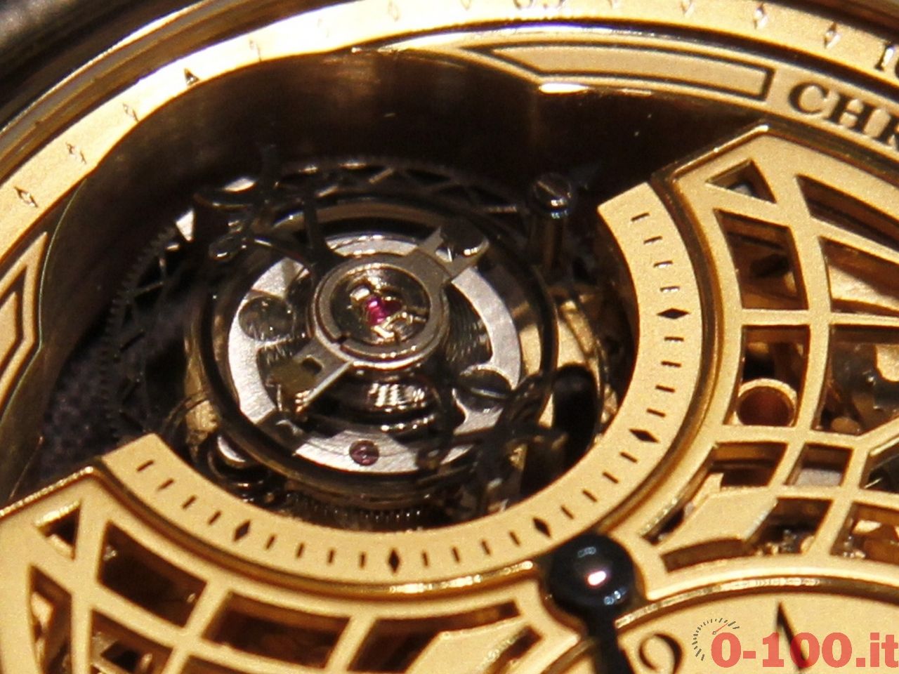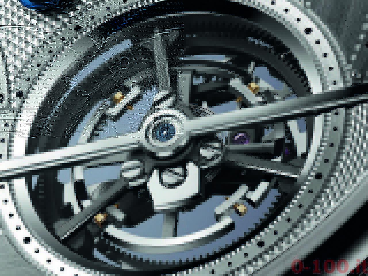 Questo meccanismo, con massa oscillante in platino e spesso soli 3 mm, ospita un tourbillon decentrato provvisto di una gabbia in titanio, una spirale in silicio e garantisce una riserva di carica di 90 ore.