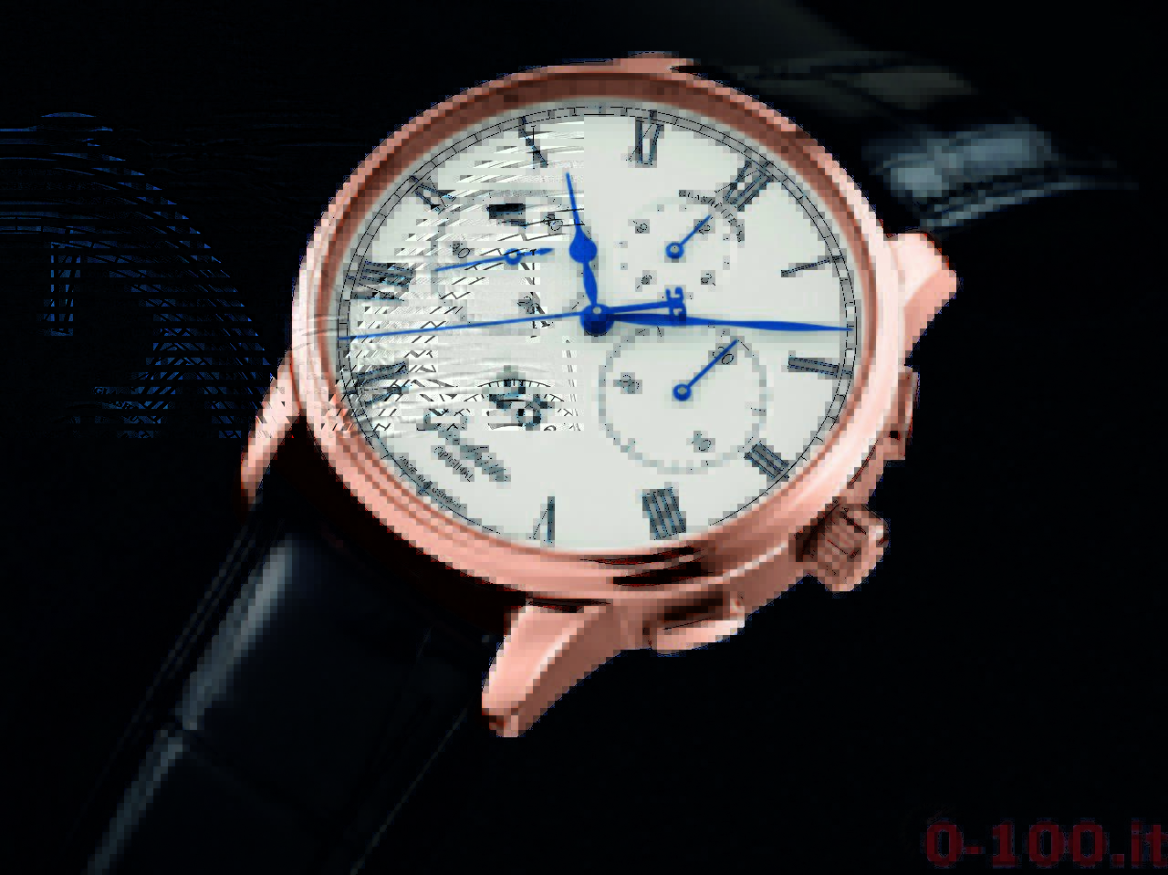 All’interno della sua cassa in oro rosa da 42 mm di diametro batte il calibro Blancpain 225L, che offre, sul quadrante bianco, le funzioni di ore, minuti, secondi alle ore 12 attraverso un’apertura sul Carrousel, datario (indicato da una lancetta a serpentina che si posiziona in corrispondenza dei giorni segnati sulla parte più esterna del quadrante) e fasi lunari.